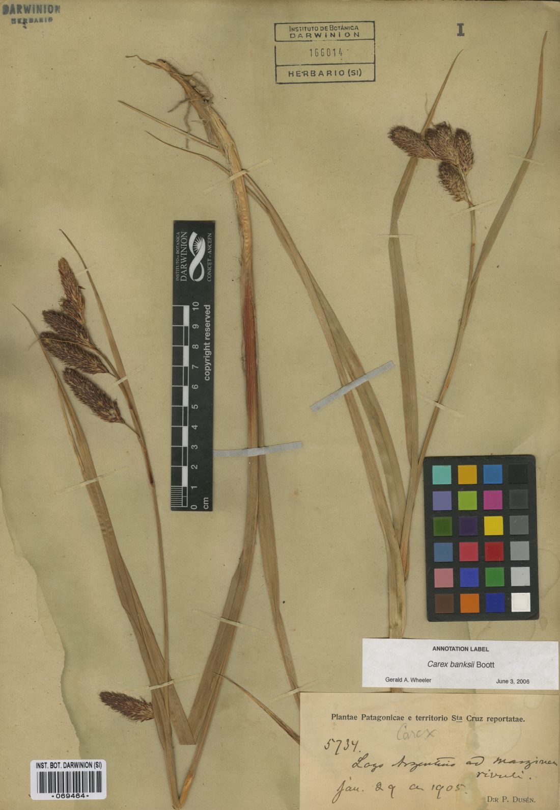 Rizoma estolonífero. Tallo de 10-80 cm de alto, obtusángulo. Hojas más cortas que el tallo, de 4-10 mm de ancho, terminadas en acumen triquetro. Espigas 3-5, rara vez más, oblongas, de 1,5-3 cm, densifloras, las superiores brevemente pedunculadas, las inferiores separadas, más largamente pedunculadas, nutantes, la terminal ginecandra o masculina, las laterales femeninas; glumas purpúreo-negruzcas, aristadas. Utrículos más anchos que las glumas, elípticos o suborbiculares, aplanados, papiráceos, de 5-7 mm, terminados en rostro purpúreo de boca bidentada; estigmas 3, largamente exertos. Aquenio elíptico u ovoide con un estípite de largo igual a la mitad del aquenio.