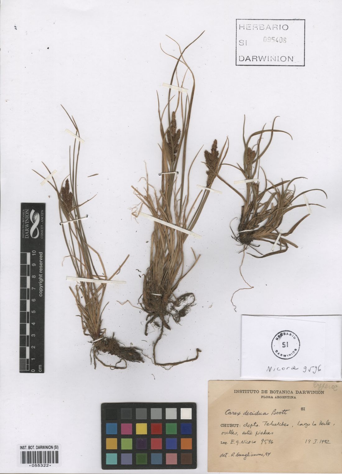 Rizoma estolonífero. Tallo de 10-30 cm de alto, liso, trígono. Hojas del largo del tallo, de 2-3 mm de ancho. Espigas 4-7 aproximadas, sésiles, erguidas, la terminal ginecandra o andrógina o masculina en los extremos y femenina en el medio, las laterales femeninas, de 1-2 cm, densifloras, la inferior algo distante; brácteas más largas que el tallo, no envainadoras; glumas pardo negruzcas. Utrículos ovales, lanceolados de 3,5 mm, pluricostulados, estipitados, de rostro corto y boca truncada; estigmas 2. Aquenio obovoide.