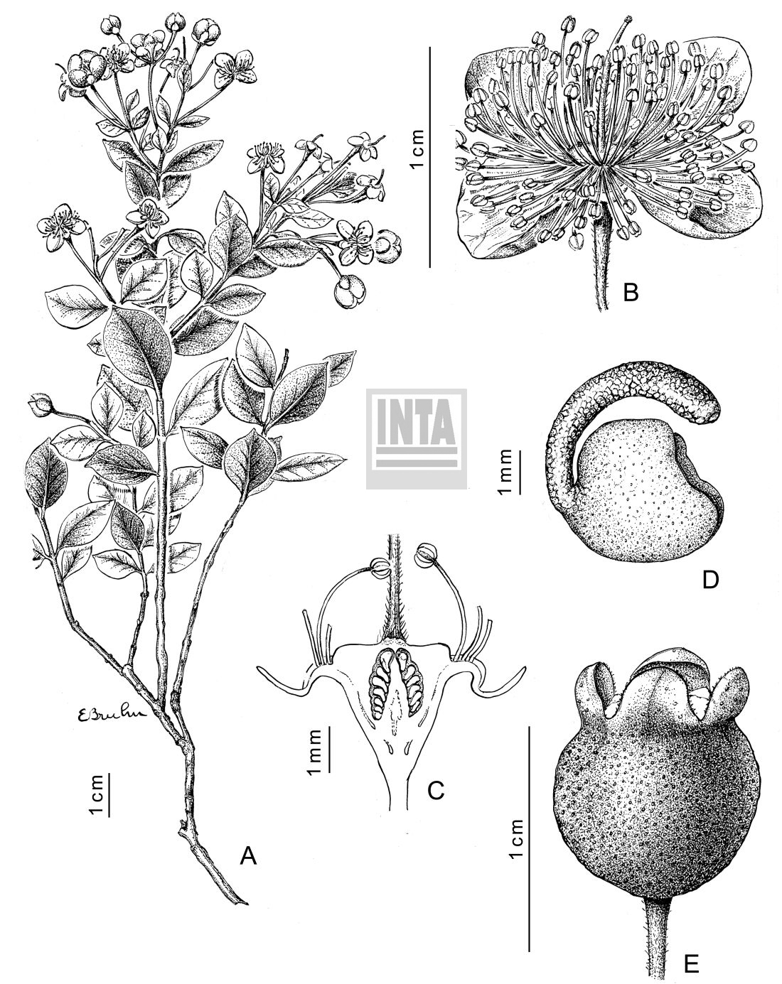 Arbusto o árbol de 2-20 m alt. con corteza ocre, blanca, ferrugínea y verdosa, desprendiéndose en franjas longitudinales, espiraladas o en placas. Ramas jóvenes pubescentes. Hojas de 10-34 x 8-18 mm, con lámina coriácea, orbicular hasta ovada, apiculada, de tamaño muy variable en la misma planta, con pubescencia dispersa sobre el nervio medio en la cara inferior y sobre el margen foliar; pecíolo de 1-4 mm, pubescente. Pedúnculos florales de 5-26 mm, pubescentes. Hipanto glabro. Sépalos de 2,5-4 mm, glabros, deltoides. Pétalos de 7-8 mm, suborbiculares. Estambres de 4-8 mm, disco estaminal piloso. Estilo de 5-7 mm, piloso. Baya hasta 14 mm diám. negro-violácea, globosa, coronada por los sépalos. Semilla de 3-4 mm, 2-3 fértiles por fruto, con tegumento tenue, verdoso u ocre. [Arbustos o árboles con corteza ocre, blanca, ferrugínea y verdosa, desprendiéndose en franjas longitudinales o en placas. Hojas de 1-3,4 x 0,8-1,8 cm, de lámina anchamente elíptica a ovada, con pubescencia dispersa sobre el nervio medio en el hipofilo y el margen foliar; hipanto glabro; sépalos glabros; estambres de 4-8 mm; disco estaminal piloso; estilo de 5-7 mm. Fruto hasta 1,5 mm, subgloboso. n = 10 (Titow de Tschischow, Bol. Soc. Biol. Concepción (Chile) 31: 145-147. 1956). 2n = 22 (Landrum, op. cit.: 19. 1981).