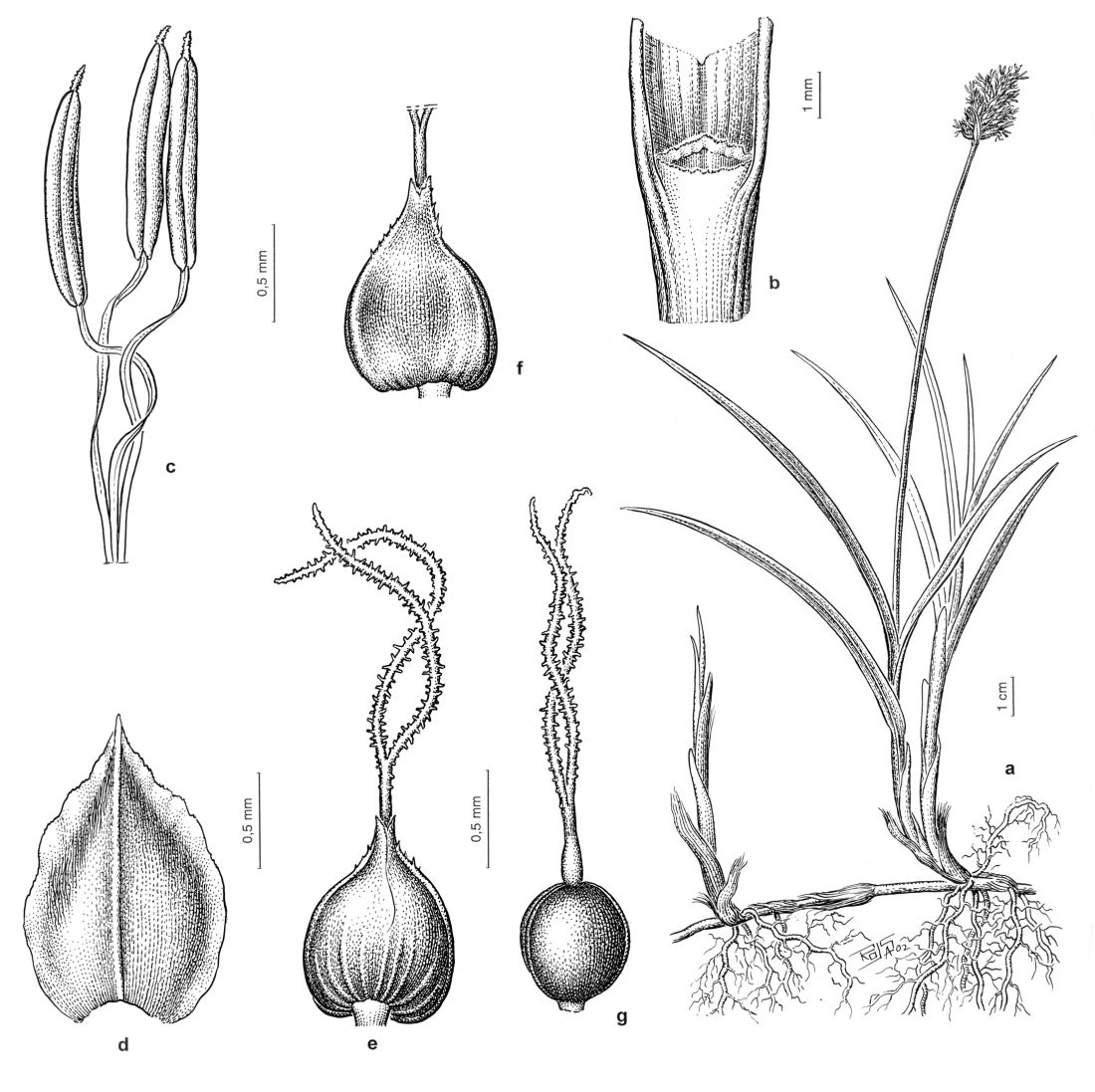 A. Planta. B. Base foliar con vaina y lígula. C. Flor estaminada. D. Gluma pistilada. E. Vista dorsal del utrículo. F. Vista ventral del utrículo. G. Aquenio.