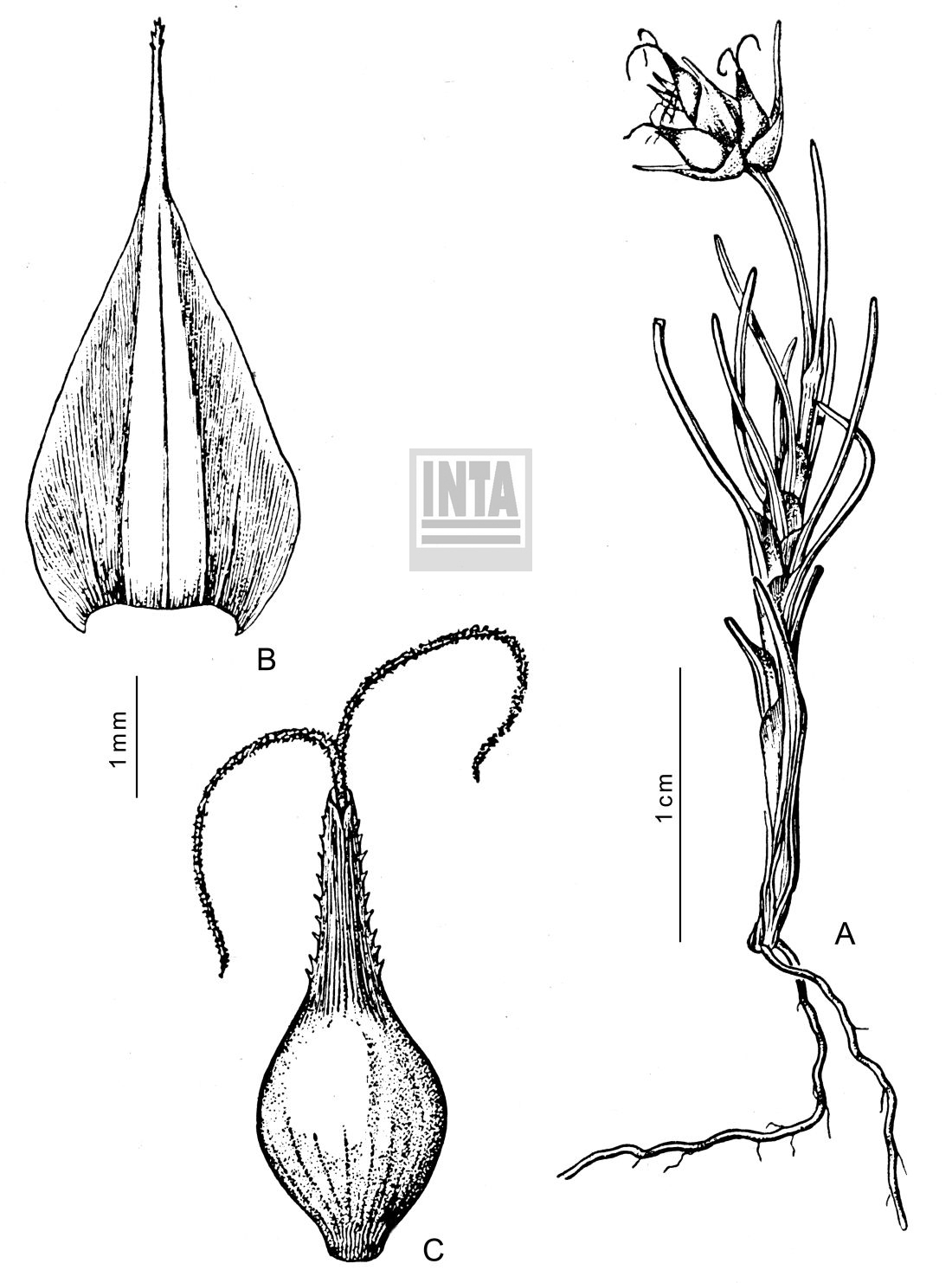 Perenne, cespitosa. Tallos capilares de 2,5-4 cm de alto, plurifoliados. Hojas capilares; lámina de 4-7 mm, de bordes ciliolados. Espiguilla terminal, andrógina, de 3-4 mm de alto con 2 brácteas glumifonnes fértiles, flores masculinas 2, triandras, flores femeninas 2-3, diginas, de estigmas largamente exertos. Utrículos biconvexos, de 3 mm, terminados gradualmente en rostro pardo de boca oblicua, hendida por delante; estigmas 2. Aquenio de 2 mm; raquilla secundaria linear, del largo del aquenio, trinervada, de bordes ciliolados.