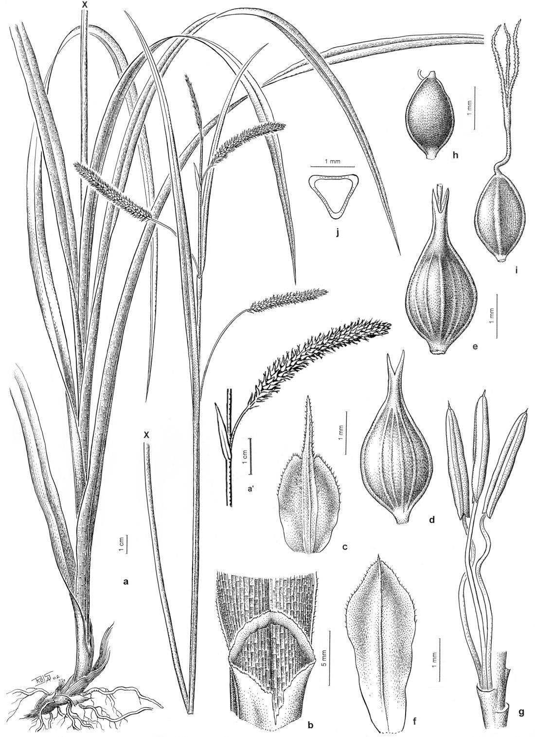 A. Planta, separada en xx en base e inflorescencia. A'. Detalle de espiga femenina. B. Base foliar con vaina y lígula. C. Gluma de la flor pistilada. D. Utrículo, vista dorsal. E. Utrículo, vista ventral. F. Gluma de florestaminada. G. Flor estaminada. H. Aquenio, cara dorsal. I. Aquenio. cara ventral. J. Corte transversal esquemático del aquenio.