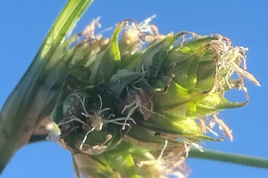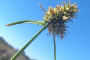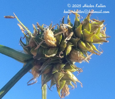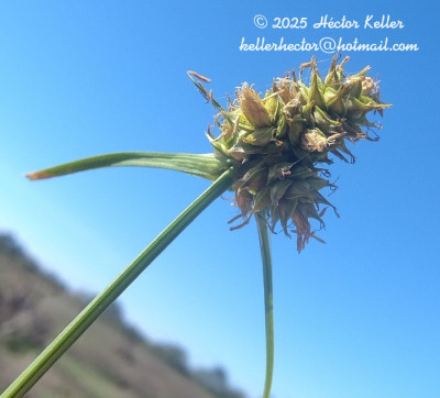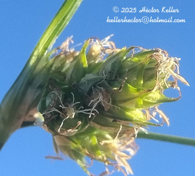Densamente cespitosa. Tallos ligeramente arqueados de 1,5-6 cm de alto. Hojas numerosas de 1-1,6 mm de ancho, semicilíndricas en la base, planas hacia el ápice. Inflorescencia andrógina de 4-5 mm de alto; porción masculina con 1-2 flores diandras; porción femenina de 3-4 flores; glumas femeninas mucronadas; bráctea inferior glumiforme con un mucrón de 5-12 mm, fértil. Utrículo elíptico de 3 mm, de rostro brevemente bidentado y bordes esca broso-híspidos; raquilla secundaria de 1-1,2 mm, lanceolada, con un mucrón de bordes ciliolados. Estigmas 2.