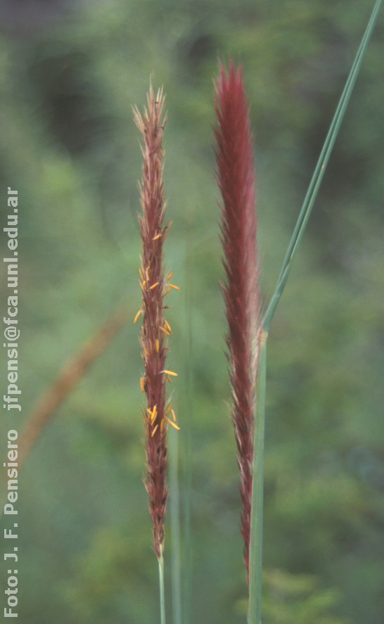 Plantas perennes, cespitosas, con rizomas alargados y gruesos; cañas herbáceas, huecas, lisas, de 50-130 cm de alto y 3-6 mm de diámetro, ramificadas desde la base en forma de abanico (aspecto iridiforme), entrenudos glabros, nudos glabros o hirsutos; vainas glabras, de 6-20 x 0,3-1,2 cm, sin yema en su axila; lígulas pestañosas, formadas por un anillo de pelos cortos de 1,5-3 mm de largo; láminas lineales, generalmente conduplicadas, a veces planas, de 13-35 x 0,2-1,3 cm, glabras o escabrosas, de ápice agudo, con el nervio medio inconspicuo. Inflorescencia en panoja espiciforme terminal, solitaria en el eje floral, elipsoide, densa, rígida, exerta, castaño-pajiza, de 4-13(-16) x 1,2-2 cm considerando las setas (1-1,5 cm de ancho excluyendo las setas); pedúnculos filiformes, angulosos, hasta de 25 cm de largo, generalmente rectos; raquis de la panoja longitudinalmente estriado, generalmente flexuoso, escabroso o apenas pubescente, no dispuesto en zig-zag; involucro formado por (10-)15-40 setas lineal-escabrosas, desiguales en largo, menores, iguales o mayores a la espiguilla, de 4-11 mm de largo, generalmente con una seta más larga que las restantes, de 10-25 mm de largo. Espiguillas lanceoladas, solitarias en cada involucro, de 5,5-7,5(-8) x 1-2 mm, subsésiles, glabras a escabrosas, 2-floras, con el antecio inferior generalmente estaminado y el superior perfecto, base de la espiguilla con anillo de pelos; gluma inferior membranácea, de 0,3-1,5 mm de largo, 0(-1)-nervia, de ápice obtuso o redondeado, a veces con los márgenes pestañosos; gluma superior membranácea, de 0,7-3(-3,5) mm de largo, 1(-3)-nervia, de ápice agudo; lemma inferior oblonga, de 5-7(-7,5) x 1-1,5 mm, 5-nervia, las nervaduras difusas, de ápice agudo; pálea inferior generalmente presente, de 4-6 mm de largo, rara vez ausente; lemma superior lanceolada, de 5-7 x 1-2 mm, 5-nervia, de ápice agudo; pálea superior menor que la lemma, de 4,5-6 mm de largo; estambres 3, anteras de 2-4 mm de largo, de ápice glabro, con los filamentos estaminales rara vez exertos; gineceo con las ramas estigmáticas exertas, persistentes y conspicuas, de 3-6 mm de largo, estilos soldados hasta su ápice; cariopsis globosa, de 1,5-2,5 mm de largo.