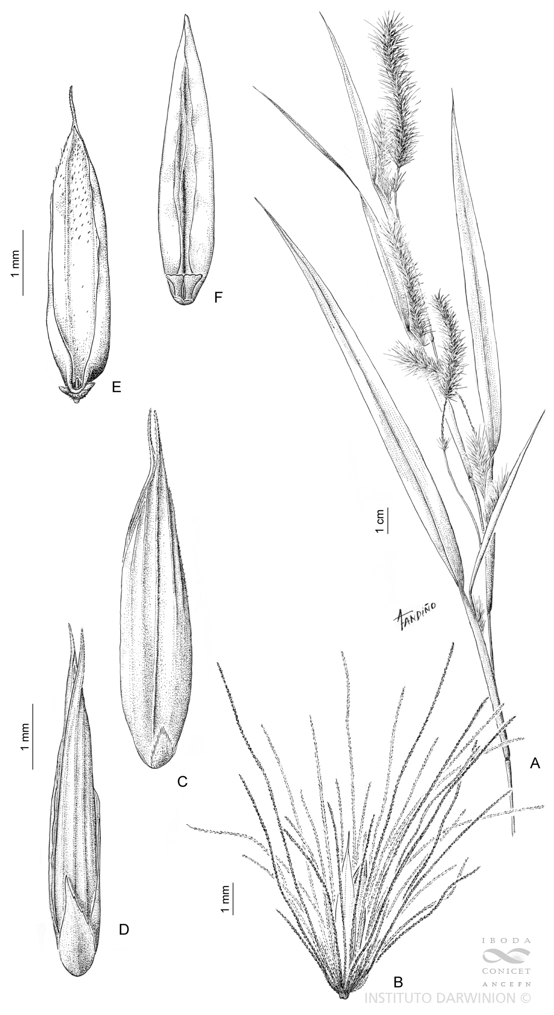 A. Porción de la inflorescencia. B. Espiguilla con involucro. C. Espiguilla vista dorsal. D. Espiguilla vista ventral. E. Antecio superior vista ventral. F. Pálea superior.