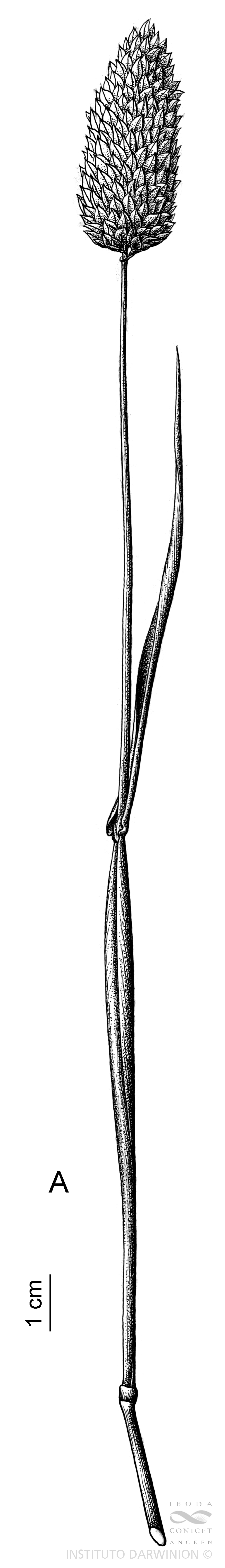 Plantas anuales; cañas hasta de 1 m de alto; vainas usualmente mas cortas que los entrenudos, glabras, con los márgenes membranáceos; lígulas obtusas, de 6-8 mm de largo; láminas linear a linear-lanceoladas, de 7-40 cm x 3-10 mm, planas, de base redondeada y ápice agudo, glabras. Inflorescencia una panoja ovoide, de 2-5 x 1,2-2 cm, muy compacta. Espiguillas dispuestas en forma imbricada. Glumas de 6-10 mm de largo con bandas longitudinales de color verde oscuro, notablemente aladas en los ? superiores; antecio fértil de 5-7,5 x 2,3-2,6 mm, de color pajizo, cortamente pubescente; antecios estériles con lámina lanceolada y callo basal inconspicuo, que llegan hasta la ½ de la lemma fértil, pubescentes especialmente hacia el ápice, con pelos delicados adpresos.