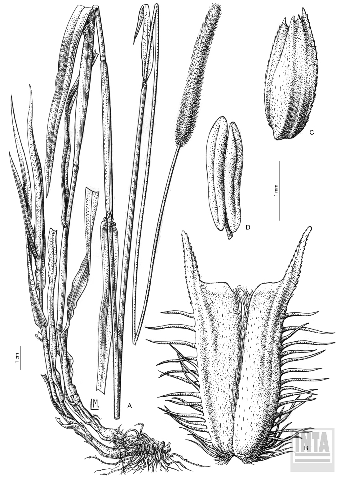 Plantas perennes, cespitosas, de 10-150 cm de alto; cañas erectas a geniculadas en la base; 3-6 entrenudos, lisos o ásperos en la base; nudos castaños, glabros; vainas usualmente más cortas que los entrenudos, estriadas, glabras, con el dorso redondeado; lígulas membranáceas, truncadas, en las hojas inferiores de 1,5-3 mm de largo, en las superiores hasta de 6 mm; láminas lineares, de 12-45 x 0,6-1 cm, planas, disminuyendo en tamaño hacia la porción distal de las cañas, escabrosas en la cara adaxial o en ambas superficies, de base subredondeada, los márgenes escabrosos. Inflorescencias espiciformes, cilíndricas, densas, de 6-15 cm de largo, en ocasiones hasta de 30 cm, usualmente no interrumpida; pedicelos cortos. Espiguillas de 3-4 mm de largo incluyendo la arsita, subsésiles, lateralmente comprimidas, verdes a púrpuras; glumas persistentes, subiguales, tan largas como la espiguilla, escabrosas, de ápice aristado, arista rígida y corta, escabrosas, de 1-2 mm de largo, el dorso aquillado, quilla con pelos gruesos, rígidos, blancos, patentes; 3-nervias, los nervios laterales aproximados al central; gluma inferior con pelos largos y blandos a lo largo de los márgenes; lemma de 2 mm de largo, ½-¾ del largo de la espiguilla, hialina, de ápice truncado e irregularmente dentado, con el dorso cubierto por pelos cortos, 5-7-nervia, el nervio central escabroso y comúnmente prolongado en un pequeño mucrón; pálea casi tan larga como la lemma, hialina 2-aquillada; anteras de 2 mm de largo; cariopsis globoso, de 1,5-2 mm de largo.