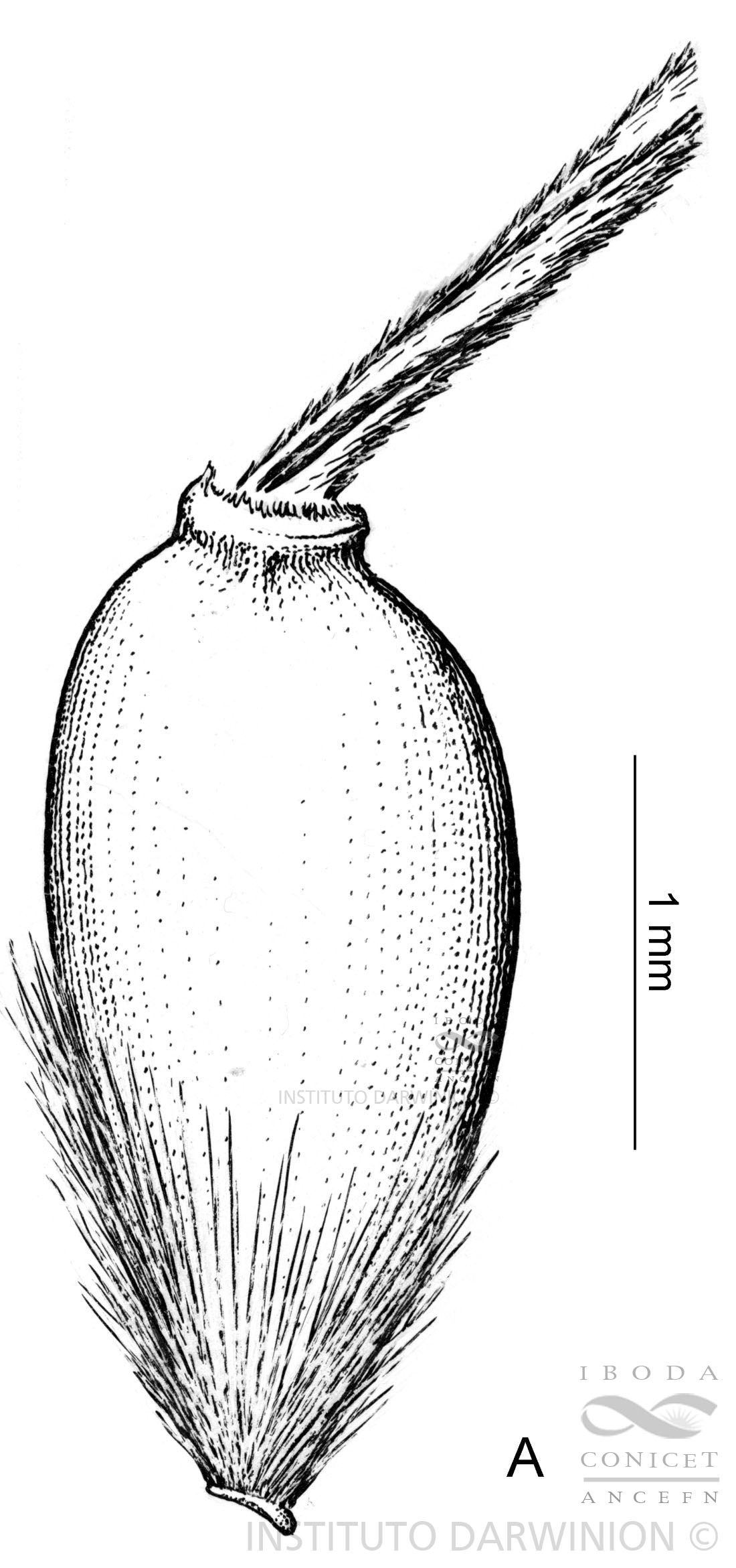 Plantas de 45-50 cm de altura; cañas floríferas de 0,8 mm de diámetro, 2-nodes glabras; nudos castaños, glabros; entrenudos de 12-14 cm de largo; vainas aplicadas al tallo, estriadas, glabras; lígula truncada, de 0,4-0,5 mm de largo, glabra; láminas lineares, convolutas o planas, de 20-30 cm x 0,5-2 mm, agudas, ambas caras estriadas, más conspicuamente el epifilo, glabras, los márgenes levemente escabriúsculos; pedúnculo estriado, glabro. Inflorescencia una panoja de 10-15 cm de largo, de 10-20 espiguillas, con ramificaciones contraídas o laxas, ascendentes, aplicadas al eje principal; pedicelos ligeramente aplanados, híspidos o glabros. Espiguillas de 3,5-4 x 1,2-1,5 mm; glumas más largas que el antecio, acuminadas, violáceas, hialinas hacia el borde, glabras, escabriúsculas sobre el nervio medio; gluma inferior de ca. 4 mm de largo, 5-nervia; gluma superior de ca. 3,5 mm de largo, 5-nervia; antecio obovoide, ligeramente comprimido y giboso, de 2,2-2,5 x 1-1,2 mm; lemma ceñida por debajo de la corona, de 2,2-2,5 mm de largo, con finas estrías longitudinales, sin apéndices epidérmicos; corona ceñida a la base de la arista de 0,5 mm de diámetro, poco conspicua, con escasas hileras de ganchos y aguijones; antopodio de 0,3 mm de largo, obtuso, truncado, cubierto por pelos dorados, densamente dispuestos, los superiores alcanzando la mitad de la longitud del antecio; arista geniculada o bigeniculada, de 1,1-1,5 cm de largo; pálea de 2,2 mm de largo; lodículas 2, de 0,6-0,7 mm de largo, elípticas, membranáceo-hialinas, glabras; cariopsis no vista.