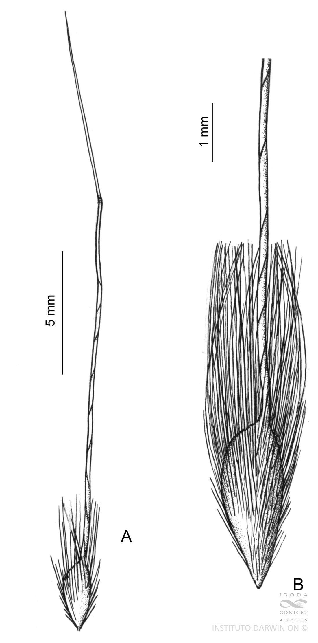 Plantas de (0,40-)0,80-1 m de altura; cañas floríferas delgadas, gráciles, de 1 mm de diámetro, 3-4 nodes; nudos castaños o blanquecinos, comprimidos a engrosados, glabros, los basales levemente pilosos; entrenudos de (4-)11-12 cm de largo; vainas ceñidas al tallo, generalmente menores que los entrenudos, de aproximadamente 8 cm de largo, con márgenes membranáceos, delgados, glabros o escabriúsculos; lígula de 1-2 mm de largo, obtusa; láminas lineares, convolutas, rara vez planas, de (4,5-)15-25 cm x 1 mm, agudas, el margen escabriúsculo, epifilo notablemente estriado, glabro, a veces escabriúsculo en la base, hipofilo levemente estriado, glabro o ligeramente pubescente; pedúnculo cilíndrico, de 10-13 cm de largo, ligeramente estriado, glabro. Inflorescencia una panoja de 12-25 x 3-8 cm, de 30-40 espiguillas, con ramificaciones laxas, levemente estriadas hacia el ápice, escabriúsculas en toda su superficie; pedicelos cilíndricos, de 2-7 mm de largo, rectos o sinuosos, hispídulos. Espiguillas ligeramente obovoides, hasta de 7,5(-10) x 1,5 mm, solitarias o en pares con pedicelos desiguales; glumas más largas que el antecio, de 5,5-7,5(-10) mm de largo, conspicuamente acuminadas; la inferior 5(-7) nervia, la superior 5(-6) nervia, violáceas, hialinas hacia el margen, glabras, escabriúsculas sobre el nervio medio y acumen; antecio obovoide, de 2,3-3 x 1 mm, ligeramente comprimido, poco giboso; lemma ceñida por debajo de la corona, de 2,3-3 mm de largo, con ganchos densa y uniformemente dispuestos, cubiertos por macropelos dorados o castaños muy densamente dispuestos, hasta de 4 mm de largo, la mayoría superando notablemente el largo del antecio; corona inconspicua, ceñida a la base de la arista, con aguijones y macropelos erguidos; antopodio obtuso, de 0,5-0,8 mm de largo, cubierto por pelos densamente dispuestos, los superiores alcanzando la mitad del largo del antecio; arista bigeniculada, de 1,5-3 cm de largo; pálea de 2-2,5 mm de largo, papilosa en el surco entre las quillas, a veces laciniada en el ápice; lodículas 2, de 0,5 mm de largo, elípticas, glabras; cariopsis obovoide, rara vez elipsoide, de 1,5-2 x 0,5-0,8 mm, levemente comprimida; hilo linear; embrión ? del largo de la cariopsis.