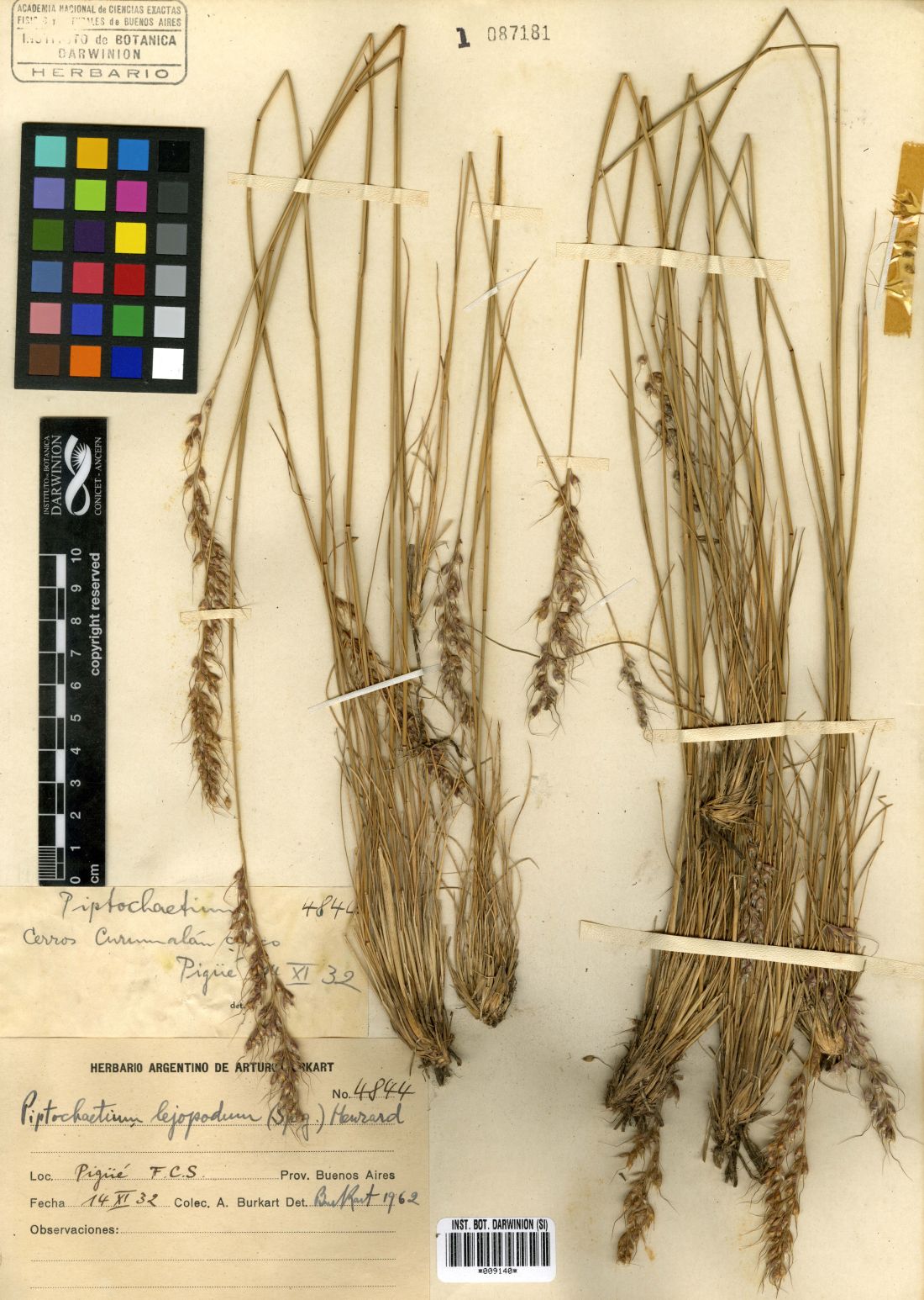 Plantas de (15-)25-80 cm de altura; cañas floríferas de ca. 0,8 mm diámetro, 2-3 nodes; nudos castaños, comprimidos, glabros; entrenudos de 7-25 cm de largo; vainas ceñidas al tallo, de 4-13 cm de largo, ligeramente estriadas, glabras; lígula de 1,5-3 mm de largo, con borde entero, glabra, escabriúscula en la cara interna; láminas lineares, convolutas, de (4-)7-22 cm x 0,8-1 mm, agudas, glabras, el margen escabriúsculo, epifilo notablemente estriado, escabriúsculo, hipofilo ligeramente estriado, a veces escabriúsculo hacia la base; pedúnculo cilíndrico, de (4-)9-22 cm de largo, estriado, glabro, escabriúsculo hacia la inflorescencia. Inflorescenia una panoja de 3,5-16 x 1-5 cm, de 10-65 espiguillas, con ramificaciones contraídas, cilíndricas, ligeramente comprimidas, estriadas, escabrosas; pedicelos de 1-10 mm de largo, escabriúsculos. Espiguillas de 5-6 x 3-4 mm; glumas más largas que el antecio, de 6-9 mm de largo, agudas, aristuladas, 5-nervias, violáceas en el dorso medio, hialinas hacia el margen, glabras; antecio obovoide, ligeramente comprimido y giboso, de 2,5-4(-5) x 1,5-2,2 mm, castaño a la madurez; lemma ceñida por debajo de la corona, longitudinalmente estriada, con estrías muy delgadas, brillante, glabra, con escasos ganchos poco notables por debajo de la corona; corona conspicua, ensanchada, de 1,5-1,8 mm de ancho, ligeramente revoluta, densamente cubierta por ganchos y aguijones; antopodio hasta de 0,5 mm de largo, obtuso, glabro, rara vez con escasos pelos cortos; arista bigeniculada, de 10-15 mm de largo; pálea de 2,5-4 mm de largo; lodículas 2, obtriangulares, a veces obovadas, de 1-1,5 mm de largo, glabras; cariopsis no vista.