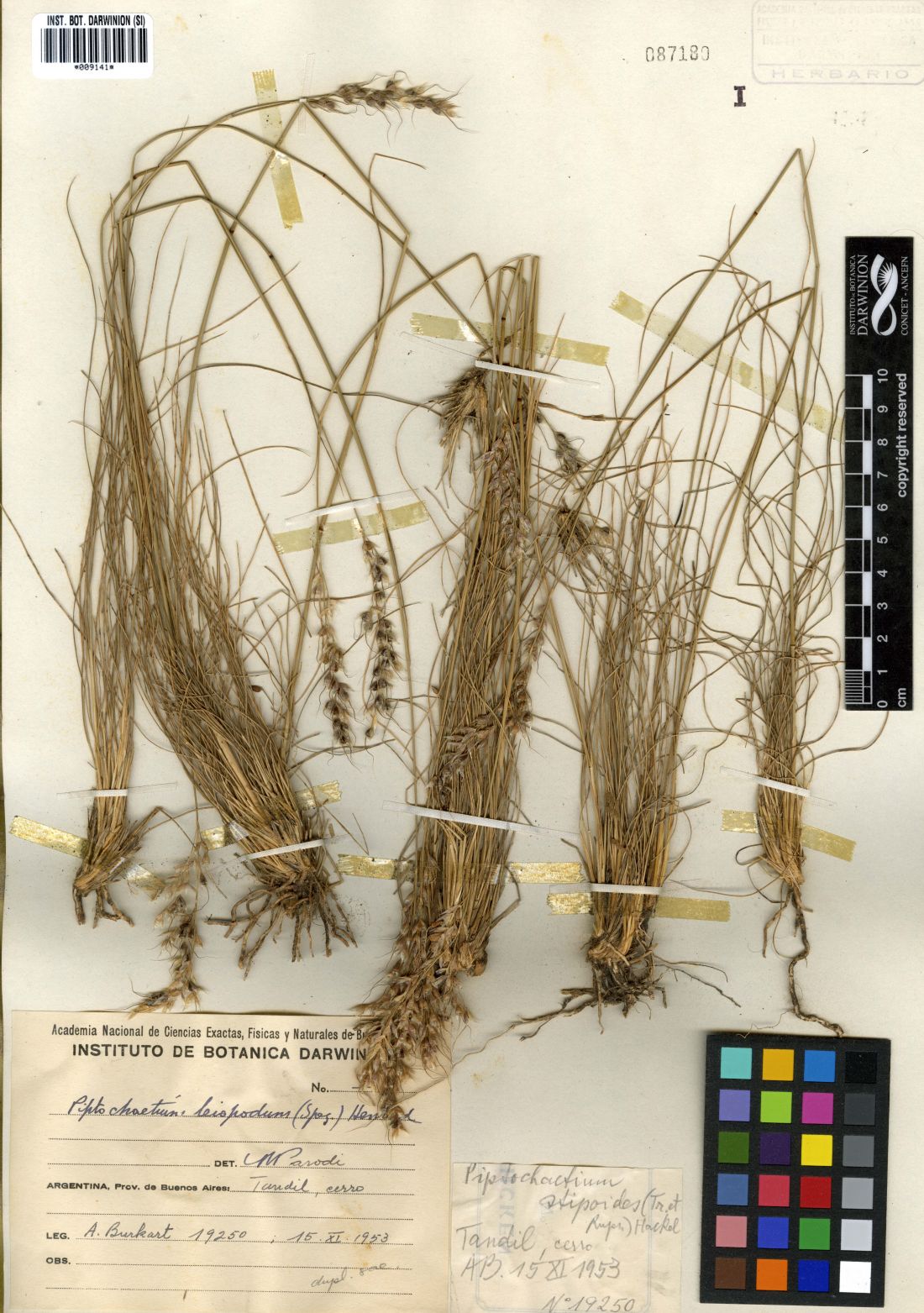 Plantas de (15-)25-80 cm de altura; cañas floríferas de ca. 0,8 mm diámetro, 2-3 nodes; nudos castaños, comprimidos, glabros; entrenudos de 7-25 cm de largo; vainas ceñidas al tallo, de 4-13 cm de largo, ligeramente estriadas, glabras; lígula de 1,5-3 mm de largo, con borde entero, glabra, escabriúscula en la cara interna; láminas lineares, convolutas, de (4-)7-22 cm x 0,8-1 mm, agudas, glabras, el margen escabriúsculo, epifilo notablemente estriado, escabriúsculo, hipofilo ligeramente estriado, a veces escabriúsculo hacia la base; pedúnculo cilíndrico, de (4-)9-22 cm de largo, estriado, glabro, escabriúsculo hacia la inflorescencia. Inflorescenia una panoja de 3,5-16 x 1-5 cm, de 10-65 espiguillas, con ramificaciones contraídas, cilíndricas, ligeramente comprimidas, estriadas, escabrosas; pedicelos de 1-10 mm de largo, escabriúsculos. Espiguillas de 5-6 x 3-4 mm; glumas más largas que el antecio, de 6-9 mm de largo, agudas, aristuladas, 5-nervias, violáceas en el dorso medio, hialinas hacia el margen, glabras; antecio obovoide, ligeramente comprimido y giboso, de 2,5-4(-5) x 1,5-2,2 mm, castaño a la madurez; lemma ceñida por debajo de la corona, longitudinalmente estriada, con estrías muy delgadas, brillante, glabra, con escasos ganchos poco notables por debajo de la corona; corona conspicua, ensanchada, de 1,5-1,8 mm de ancho, ligeramente revoluta, densamente cubierta por ganchos y aguijones; antopodio hasta de 0,5 mm de largo, obtuso, glabro, rara vez con escasos pelos cortos; arista bigeniculada, de 10-15 mm de largo; pálea de 2,5-4 mm de largo; lodículas 2, obtriangulares, a veces obovadas, de 1-1,5 mm de largo, glabras; cariopsis no vista.