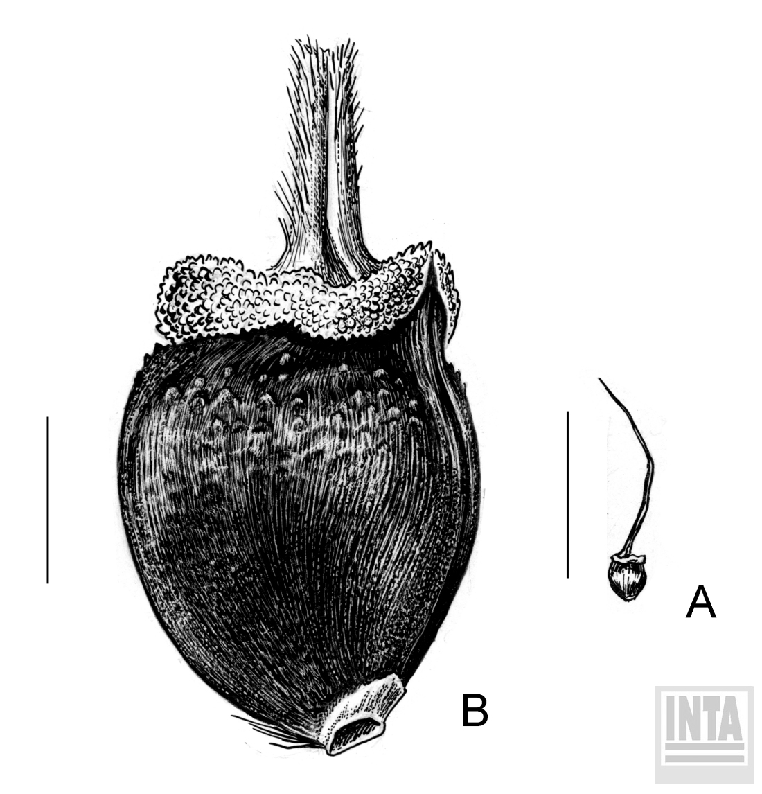 Plantas de (15-)25-80 cm de altura; cañas floríferas de ca. 0,8 mm diámetro, 2-3 nodes; nudos castaños, comprimidos, glabros; entrenudos de 7-25 cm de largo; vainas ceñidas al tallo, de 4-13 cm de largo, ligeramente estriadas, glabras; lígula de 1,5-3 mm de largo, con borde entero, glabra, escabriúscula en la cara interna; láminas lineares, convolutas, de (4-)7-22 cm x 0,8-1 mm, agudas, glabras, el margen escabriúsculo, epifilo notablemente estriado, escabriúsculo, hipofilo ligeramente estriado, a veces escabriúsculo hacia la base; pedúnculo cilíndrico, de (4-)9-22 cm de largo, estriado, glabro, escabriúsculo hacia la inflorescencia. Inflorescenia una panoja de 3,5-16 x 1-5 cm, de 10-65 espiguillas, con ramificaciones contraídas, cilíndricas, ligeramente comprimidas, estriadas, escabrosas; pedicelos de 1-10 mm de largo, escabriúsculos. Espiguillas de 5-6 x 3-4 mm; glumas más largas que el antecio, de 6-9 mm de largo, agudas, aristuladas, 5-nervias, violáceas en el dorso medio, hialinas hacia el margen, glabras; antecio obovoide, ligeramente comprimido y giboso, de 2,5-4(-5) x 1,5-2,2 mm, castaño a la madurez; lemma ceñida por debajo de la corona, longitudinalmente estriada, con estrías muy delgadas, brillante, glabra, con escasos ganchos poco notables por debajo de la corona; corona conspicua, ensanchada, de 1,5-1,8 mm de ancho, ligeramente revoluta, densamente cubierta por ganchos y aguijones; antopodio hasta de 0,5 mm de largo, obtuso, glabro, rara vez con escasos pelos cortos; arista bigeniculada, de 10-15 mm de largo; pálea de 2,5-4 mm de largo; lodículas 2, obtriangulares, a veces obovadas, de 1-1,5 mm de largo, glabras; cariopsis no vista.