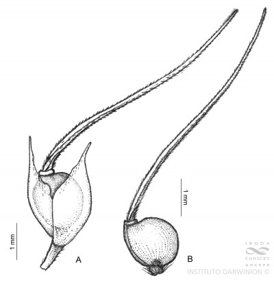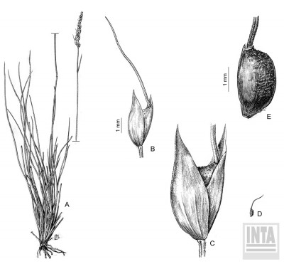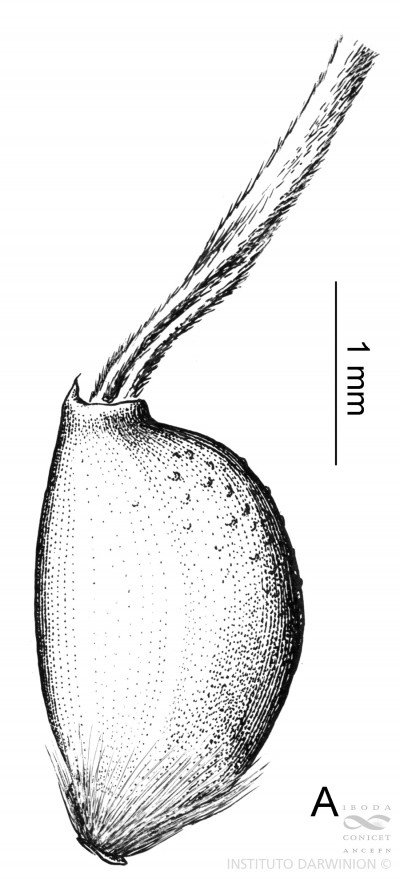 Plantas de 10-35 cm de alto; cañas floríferas, de 1 mm de diámetro, 2-3 nodes; nudos castaño-rojizos, comprimidos, glabros; entrenudos de 2,5-5,5 cm de largo; vainas ceñidas al tallo, de 2-2,5 cm de largo, longitudinalmente estriadas, membranáceo-hialinas hacia el margen, glabras; lígula de 0,6-0,8 mm de largo, con margen entero, hispídula en la cara abaxial; láminas filiformes, convolutas, de 4,5-9 cm x 0,6-0,8 mm, agudas, ambas caras estriadas, glabras a híspidas en la cara abaxial o adaxial, con margen escabriúsculo; pedúnculo cilíndrico, de 2,5-17,5 cm de largo, longitudinalmente estriado, glabro. Inflorescencia una panoja de 2-9 x 0,5 cm, de 15-60 espiguillas, con ramificaciones contraidas, cilíndricas, hispídulas; pedicelos angulosos, ligeramente aplanados, de 1-3,5 mm de largo, levemente sinuosos, híspidos. Espiguillas de 2,5-3 x 1,5 mm; glumas más largas que el antecio, de 3-4 mm de largo, aristuladas, violáceas, hialinas hacia el margen, escabriúsculas en el nervio medio y hacia el ápice; gluma inferior 5-nervia; gluma superior 3-nervia; antecio lenticular, giboso, de 1,5-2(-2,8) x 1-1,5 mm; lemma ceñida por debajo de la corona, fina y longitudinalmente estriada, brillante, glabra, negruzca a la madurez, con escasas papilas dispuestas hacia la corona o hacia el dorso, o bien sin ellas, muy rara vez con escasos ganchos; corona ceñida a la base de la arista, de 0,5 mm de diámetro, con hilera de papilas de extremo redondeado, a veces inconspicuas y escasos ganchos; antopodio de 0,3-0,4 mm de largo, obtuso, con escasos pelos blanquecinos, los superiores llegando a ? del largo del antecio, rara vez antopodio glabro; arista bigeniculada a subrecta, de 5-7 mm de largo; pálea de 2 mm de largo, terminando en pequeños pelitos; lodículas 2, de 0,5 mm de largo, obtusas; cariopsis lenticular, de 1 x 0,8 mm; hilo lineal; embrión ? del largo de la cariopsis.