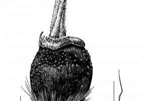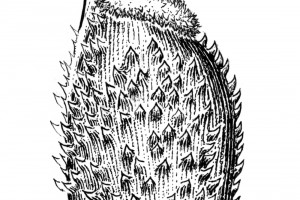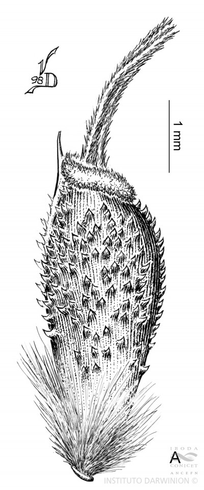 Difiere de la variedad tipo por el indumento de la lemma (con aguijones cubiertos en su base por los extremos de las células epidérmicas adyacentes, generalmente en grupos de 2 ó 3, los más desarrollados en la zona media del antecio, más pequeños hacia el antopodio y la corona), por la corona más ancha (± 1,5 mm), ligeramente revoluta, con papilas, ganchos y aguijones y por el antopodio, que es oblicuamente truncado, con pelos densamente dispuestos que alcanzan ? del largo del antecio; éstos son obovoides, globosos a comprimidos, de (2,3-)2,5-3(-4) x 1,5-1,8 mm.