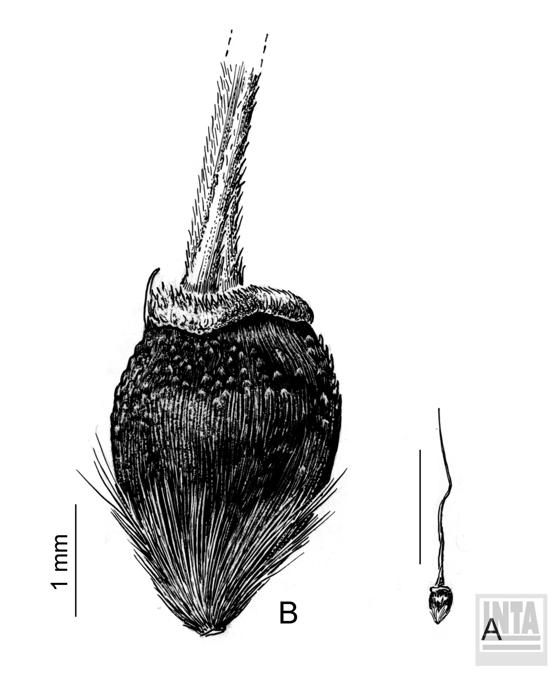 Difiere de la variedad tipo por el indumento de la lemma (con aguijones cubiertos en su base por los extremos de las células epidérmicas adyacentes, generalmente en grupos de 2 ó 3, los más desarrollados en la zona media del antecio, más pequeños hacia el antopodio y la corona), por la corona más ancha (± 1,5 mm), ligeramente revoluta, con papilas, ganchos y aguijones y por el antopodio, que es oblicuamente truncado, con pelos densamente dispuestos que alcanzan ? del largo del antecio; éstos son obovoides, globosos a comprimidos, de (2,3-)2,5-3(-4) x 1,5-1,8 mm.
