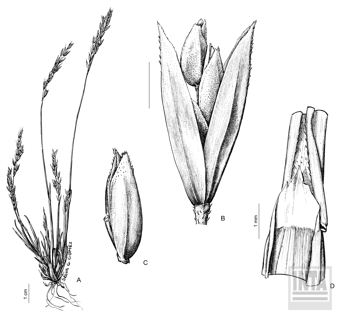 Plantas monoicas, perennes, verdes o gris-azuladas, algunas veces cerosas, cespitosas, a veces estoloníferas, macollos de bases angostas, apretados y pequeños, de 2-7 cm de alto, con innovaciones intravaginales; cañas de 8-25(-35) cm de alto, erectas o ascendentes, bien exertas, algunas veces geniculadas; entrenudos y nudos cilíndricos, entrenudos escasamente escabrosos, con 1 o ningún nudo exerto; hojas mayormente basales; vainas con los margenes fusionados en la porción inferior, levemente comprimidas, suavemente aquilladas, lisas o escasamente escabrosas, glabras, cuellos glabros o escasamente escabrosos; lígulas de 2-7 mm de largo, membranáceas, abaxialmente lisas o algo escabrosas, blancas a subhialinas, las inferiores notoriamente decurrentes, ápices agudos a acuminados, enteros o algo lacerados; láminas de 1-5 cm x 0,8-3 mm, plegadas, delgadas, margenes algunas veces involutos, erectas o levemente arqueadas, ocasionalmente como hebras, reteniendo su forma a la madurez, lisas en cara abaxial, lisas o escabrosas en cara adaxial, quilla, ápices y margenes escabrosos, ápices levemente naviculares, apiculados. Inflorescencias de 2,5-9 cm de largo, lineares a angostamente lanceoladas, contraídas, algo densas, erectas, con 20-80 espiguillas, con 1-4 ramas por nudo, las ramas más largas de 0,5-4 cm de largo, adpresas a pronunciadamente ascendentes, unas pocas angulosas, escabrosas a lo largo de los ángulos, espiguillas levemente ordenadas desde la base o el tercio basal, ramas proximales con 2-8 espiguillas, pedicelos escabrosos. Espiguillas 3,5-5 mm de largo, cuneadas a lanceoladas, comprimidas lateralmente, no vivíparas, grisáceo-verdosas a violáceas, 2-3(-4)-floras, entrenudos de la raquilla 0,5-1,5 mm de largo, lisos; glumas subiguales, usualmente más largas que los antecios adjacentes, frecuentemente sobrepasando los antecios superiores, lanceoladas, aquilladas, quillas escabrosas, con margenes escariosos, lisos o escabrosos, ápices agudos a acuminados; gluma inferior de 3,2-5,2 mm de largo, 1-3-nervia; gluma superior de 3,3-5,2 mm de largo, 3-nervia; callo glabro o lanoso; lemma proximal de 2,5-3 mm de largo, la distal marcadamente reducida, 5-nervia, lanceolada a ovada, con un largo margen escarioso, lisa, ápice y extremo de la quilla escabrosos, glabros o algo pilosos en la mayor parte de la superficie, nervios intermedios débiles a diferenciados, margenes escabrosos, ápice agudo, con una punta roma; pálea glabra o pilosa con quillas comúnmente escabrosas en la porción distal, superficie entre las quillas lisa, glabra o pilosa; lodículas de 0,4-0,6 mm de largo, cuneiformes, truncadas a oblanceoladas, con un prominente lóbulo lateral, glabras; anteras 3, de 0,4-0,8 mm de largo; cariopsis glabra, de 1,6 mm de largo, fusoide, dorada, no adherida a la pálea; hilo de 0,2 mm de largo, elíptico.