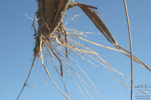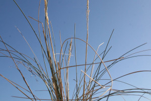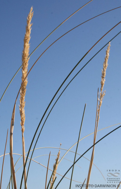 Plantas dioicas, perennes, psamófilas, verde-azuladas, con rizomas delgados, fuertes, oblicuos y profundos que permiten fijar las plantas a las dunas, macollos aislados, presencia de innovaciones intravaginales y extravaginales; cañas erguidas, de 30-80(-100) cm de alto, gráciles, nudos 2-4, exertos; vainas estriadas, lisas, glabras, de 10-20(-40) cm de largo, con el borde membranáceo, hialino, más largas que los entrenudos basales; lígulas agudas, hialinas, muy largas, de (4-)10-20(-25) mm de largo; láminas foliares plegadas, de 15-40(-60) cm x 2-5 mm, acuminadas en el ápice. Inflorescencias oblongo-lanceoladas, densas y contraídas, de 10-20(-30) x 2-4 cm, las pistiladas más densas y contraídas que las estaminadas, interrumpidas en la base quedando los entrenudos inferiores expuestos, con 11-15(-20) nudos por panoja de los que nacen ramas adpresas al eje principal, multiespiculadas, la inferior hasta de 5 cm de largo. Espiguillas comprimidas lateralmente, de 6-12 mm de largo, glabras, (3)-5-11-floras, sostenidas por pedicelos cortos; glumas oblongo-lanceoladas, acuminadas, carenadas, gluma inferior 3-5(-7) nervia, la longitud de la gluma en la espiguilla pistilada de 6-10 x 1-1,6 mm, en la estaminada de 4-7 x 0,8-1,4 mm; callo de los antecios pistilados glabros o con largos pelos lanosos; antecios estaminados glabros o con escasa pubescencia; lemma inferior elipsoide, lanceolada, 5-7(-9)-nervia, en los antecios pistilados de 7-10 x 1,3-1,5(-2) mm, completamente glabra o con pelos largos en la quilla y nervios marginales, en los antecios estaminados de 5-8 x 1-1,5 mm, glabra; pálea 2-aquillada, de 4-6 x (0,6-)1-1,5(-1,8) mm, quillas ciliado-lanosas hacia la base, o escasamente ciliadas; ovario con dos estilos cortos; estaminodios con anteras diminutas; anteras de 2,5-3 mm de largo; cariopsis elipsoidea, subtrígona de 2,5-3 mm de largo.