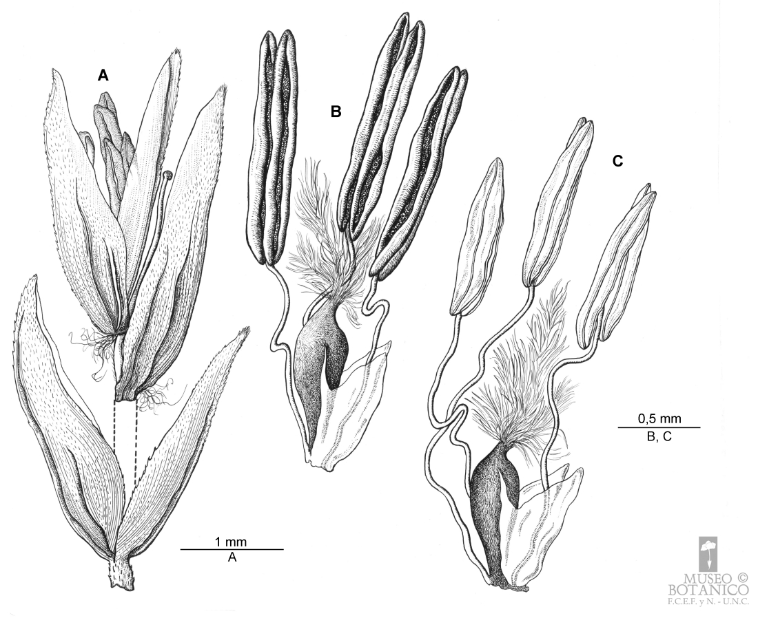 Observaciones: Anton (1978) y Anton & Ariza Espinar (1980) describieron e ilustraron adecuadamente los distintos tipos de flores que se presentan en esta especie, reconociendo además su distribución en pies diferentes; sin embargo, no llegaron a precisar su comportamiento reproductivo, probablemente por contar con pocos materiales. Posteriormente, Anton & Connor (1995), sin mayor explicación, la incluyeron en la lista de las ginomonoicas sudamericanas, lo cual es erróneo ya que se trata de una típica especie ginodioica; a esta conclusión se llega luego de analizar un número más representativo de ejemplares.