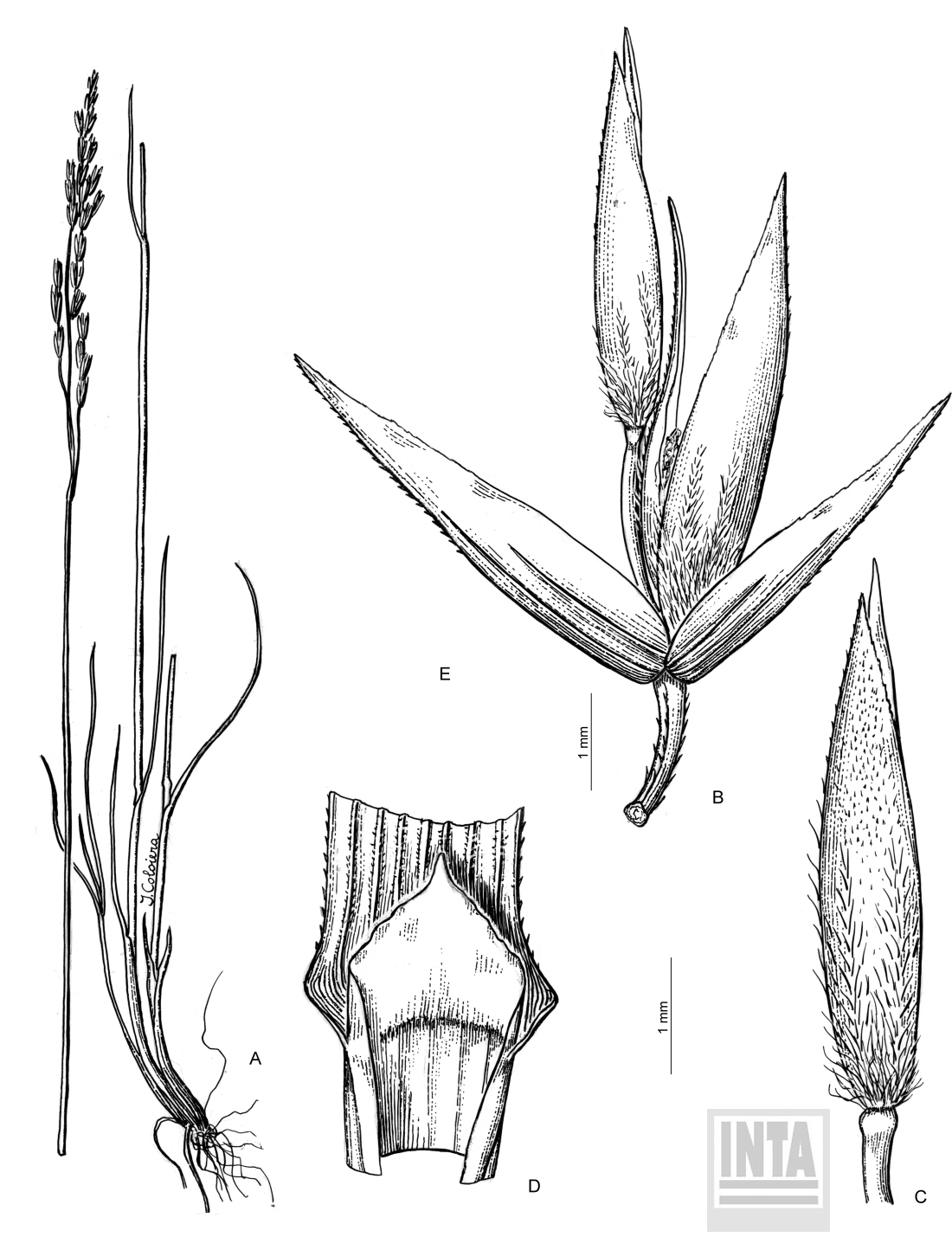 A, planta; B, espiguilla; C, antecio inferior; D, lígula.