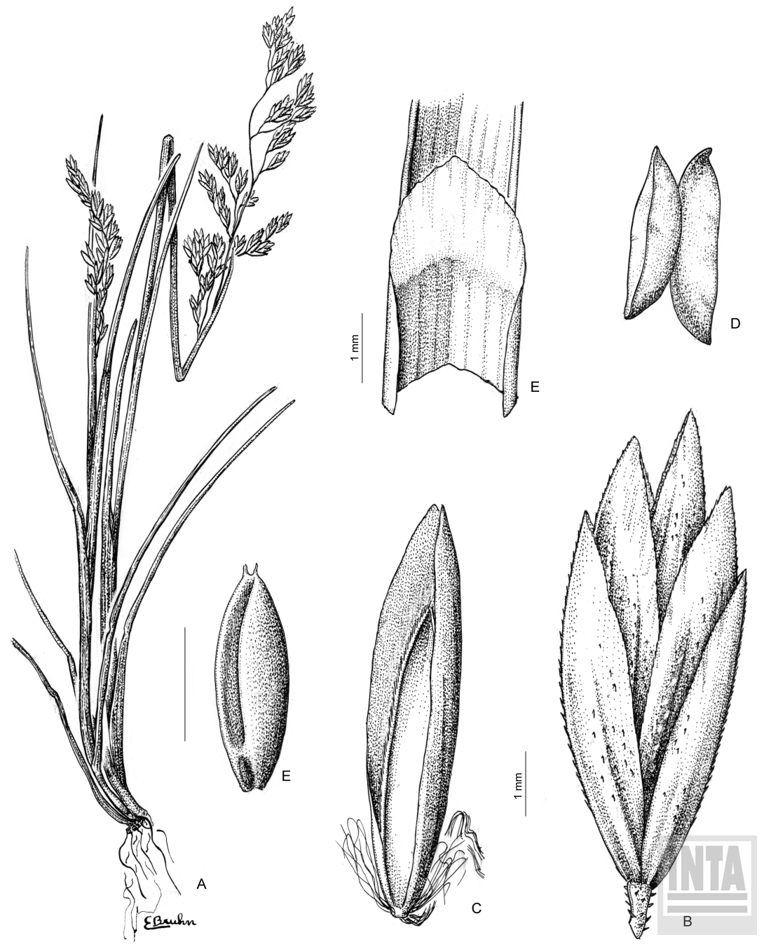 A, planta; B, espiguilla; C, pálea y lemma; D, antera; E, cariopse; F, lígula.