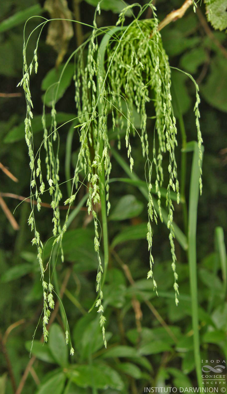 Plantas ginomonoicas, perennes, apoyantes, de 0,6-3(-3,5) m de largo, con 5-10 entrenudos largos; vainas hasta de 4-15 cm x 5-5,5 mm, escabrosas; lígulas de 0,5 x 2,6-3 mm, truncadas, margen superior finamente denticulado o lacerado, decurrentes con la vaina; láminas de 15-35 cm x 3-3,5 mm, planas o plegadas, tiernas, flexuosas, ásperas, cubiertas en toda la superficie de escabrosidades generalmente retrorsas. Inflorescencias de 20-25 x 4-7 cm, amplísimas, delicadas, anchamente ovadas o algo difusas, laxas, con ramas patentes, generalmente 4, en los nudos basales de la panoja. Espiguillas de 3-3,5(-4) x 1,5 mm, ovoides-lanceoladas, muy comprimidas, 3-4-floras, pedicelos escabrosos; glumas desiguales, las quillas con escabrosidades retrorsas en la mitad inferior, bordes membranáceos, los nervios muy evidentes; gluma inferior de 1,5-2 mm de largo, 1-nervia; gluma superior de 2-2,5 mm de largo, 3-nervia; callo glabro o con escasos pelos largos lanosos; lemma de 2-2,5 x 1,5 mm, 5-nervia, aguda, finamente escabrosa sobre la quilla; pálea de 1,7-2 mm x 0,4 mm, mucho más pequeña que la lemma, escabrosa sobre los nervios; antecios basales perfectos y distales pistilados con el androceo reducido a 3 estaminodios; flores perfectas con anteras de 1 mm de largo; cariopsis ca. 1 mm de largo.