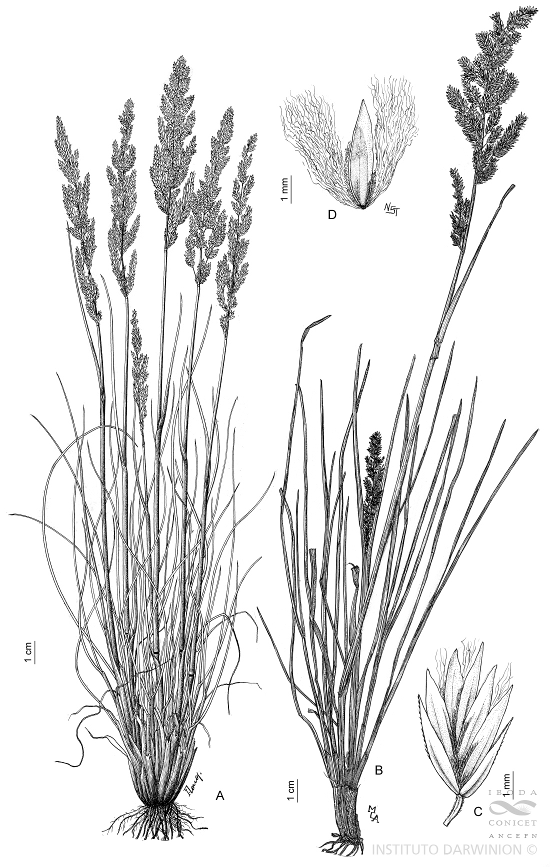 Plantas perennes, dioicas, glauco-verdosas, cespitosas, suelen formar matas densas, con bases subbulbosas e innovaciones intravaginales; cañas de (15-)25-70 cm de alto, erguidas, flexibles, de 1-2 mm diámetro, nudos 2-4, exertos; vainas foliares de (3-)5-15 cm de largo, cartilagináceas, estriadas, glabras, ensanchadas en su base y con repliegue hialino; lígulas truncadas, aovadas, membranáceas, de (0,5-)1-2(-4) mm de largo; láminas foliares de 8-25(-40) cm x 1-3(-4) mm, plegadas a planas, laxas, flexibles, con ápice navicular. Inflorescencias de (4-)8-15(-25) x 1-4(-6) cm, aovado-lanceoladas, contraídas a piramidales, densas, las ramas de los nudos basales más largas y algo abiertas, con 7-16 nudos. Espiguillas glabras, las pistiladas y estaminadas de 4-7 mm de largo, 3-5(-7)-floras; glumas lanceoladas, subiguales, con quilla algo escabrosa en el dorso; gluma inferior 1-nervia, en la espiguilla pistilada de 3-4,5 x 0,6-0,9 mm, en la estaminada de 2,5-3,5 x 0,6-0,9 mm; gluma superior 3-nervia, en la espiguilla pistilada de 3,8-4,2 mm de largo, en la estaminada de 2,2-3,5 mm de largo; callo de los antecios pistilados con pelos lanosos y largos; lemma membranácea, lanceolada, 5-nervia, glabra o pubescente entre los nervios, quilla y nervios marginales ciliados, la de los antecios pistilados de 4-6 mm de largo x 0,8-1,1 mm de semiancho, la de los antecios estaminados glabra o algo pubescente, de 3-4 mm de largo x 0,7-1,1 mm de semiancho; pálea hialina de (2-)2,5-3,5(-4,5) x 0,5-0,8(-1) mm, 2-carinada, carinas escabrosas; estaminodios diminutos; anteras de 1,5-1,7 mm de largo; cariopsis obovoidea-elipsoidea, subtrígona, de 2 mm de largo.