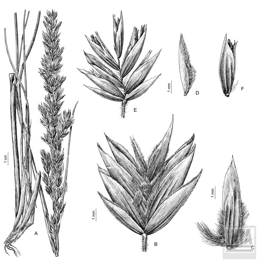 A, planta; B, espiguilla femenina; C, antecio femenino; D, pálea; E, espiguilla masculina; F, antecio masculino.