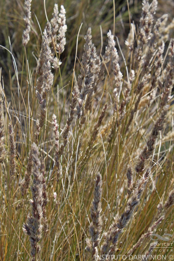 Plantas perennes, dioicas, verdosas, cespitosas, formando matas densas, con innovaciones intravaginales; cañas de (10-)20-50(-65) cm de alto, delgadas y rígidas, nudos 2-4, exertos; vainas foliares 5-15(-20) cm de largo, lisas o escabrosas, cartilagináceas y dilatadas en la base y en los margenes, las basales blanquecino-pajizas; lígulas aovadas a agudas, hialinas, a veces laceradas, de (0,5-)2-10(-15) mm de largo; láminas foliares de 5-20(-35) cm x 1-2(-3) mm, plegadas a convolutas, lineares, filiformes, ápices naviculares a levemente agudos. Inflorescencias de 4-12(-16) x (0,5-)1-2,5 cm, erectas, contraídas, densas, linear-oblongas, verde a violáceas, con 10-15(-20) nudos por panoja de los que nacen ramas adpresas al eje principal. Espiguillas pistiladas de 5,5-7(-8) mm de largo, las estaminadas de 4,5-6 mm de largo, 3-8(-10)-floras; glumas lanceoladas, algo escabrosas, subhialinas, con margenes escariosos, gluma inferior 1(-3)-nervia, en espiguillas pistiladas de 2,5-4(-5) x 0,6-1 mm, en estaminadas de 2-3 x 0,5-0,8 mm; gluma superior 3-nervia, en espiguillas pistiladas de 3,5-4,5 mm de largo, en estaminadas de 3-4 mm de largo; callo de los antecios pistilados con pelos lanosos, largos y plegados; lemma de antecios pistilados pubescente entre los nervios, quilla y nervios marginales; antecios estaminados glabros o algo pubescentes; lemma inferior de los antecios pistilados de 4-5(-6,5) mm de largo x 0,8-1,1(-1,3) mm de semiancho, en los antecios estaminados de 3-4 mm de largo x 0,7-1,1 mm de semiancho; pálea 2-aquillada, pilosa en la mitad inferior de las quillas, escabrosa en la porción superior, pubérula entre las quillas, de 2-3(-4) x 0,5-0,8 mm; estaminodios diminutos; anteras de 1,5-2 mm de largo; cariopsis elipsoidea, subtrígona, de 1,5-2,8 mm de largo.