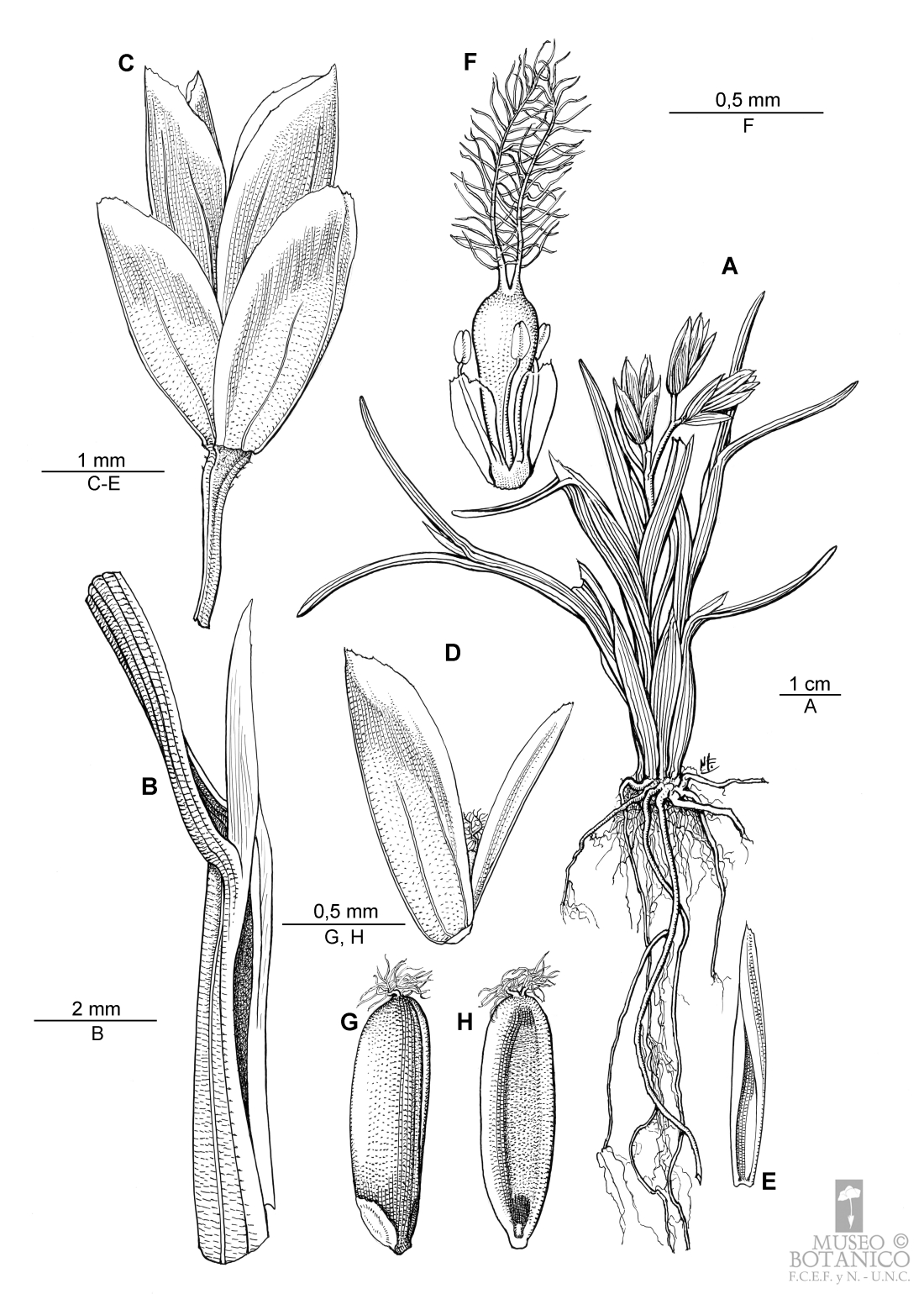 A, hábito; B, lígula; C, espiguilla; D, antecio basal pistilado; E, pálea; F, flor pistilada con estaminodios diminutos y lodículas; G-H, cariopsis, vista lateral e hilar respectivamente.