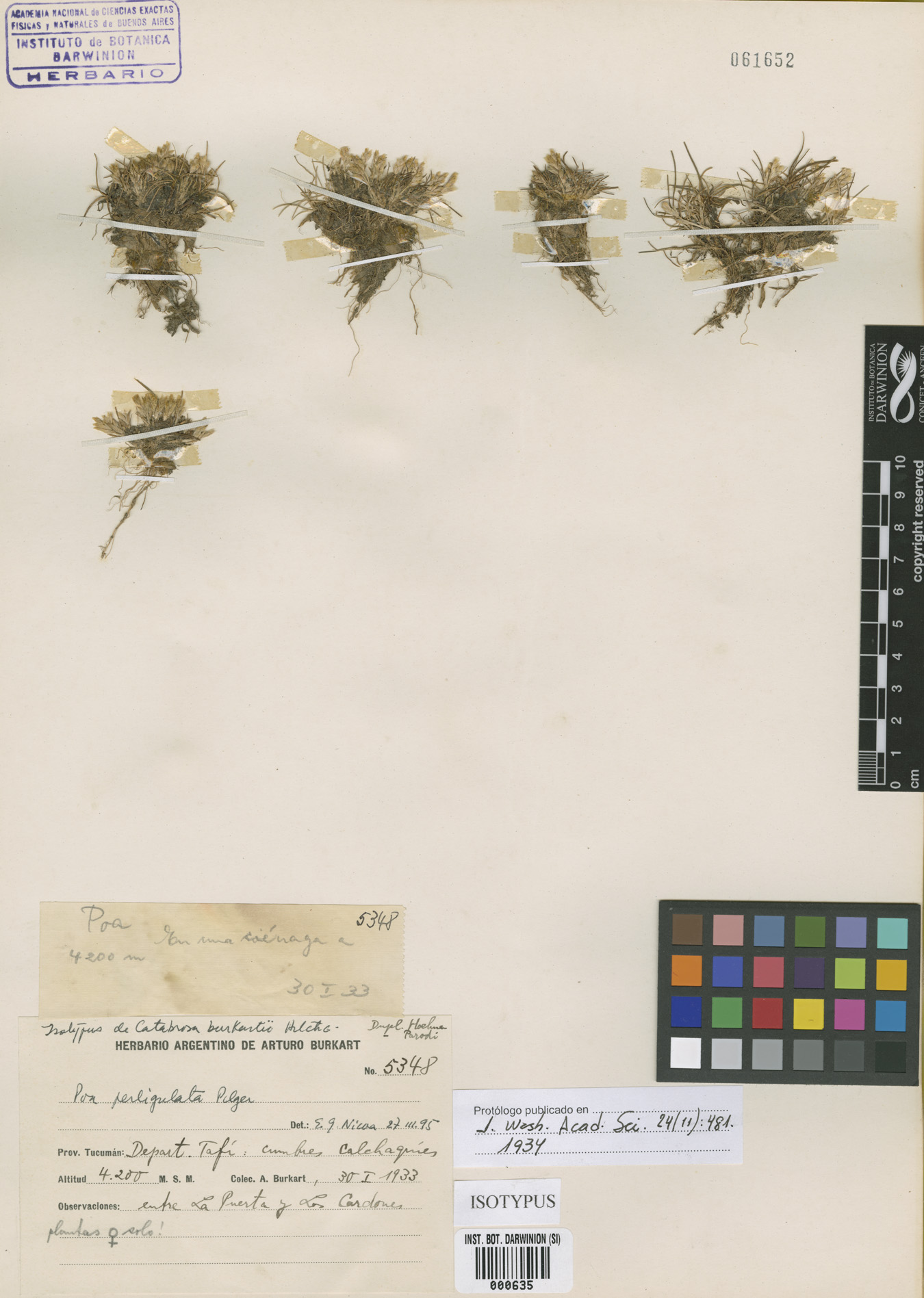 Material Tipo: Bolivia. Santa Cruz, Cordillera de Azanaque, Quellmoore, 4500 m s.m., Dic 1926, C. Troll 3014 (lectotipo, BAA-2652!, designado por M. A. Negritto & A. M. Anton, Kurtziana 28: 122. 2000; isolectotipo, US-88747!, fragmento ex B).