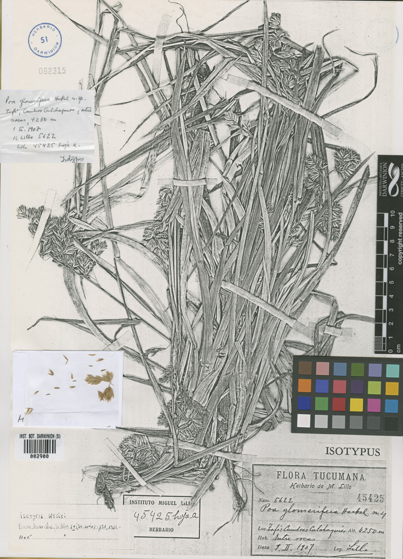 Observaciones: En algunos ejemplares el androceo de las flores perfectas, aunque trímero, muestra diferentes grados de reducción, siendo frecuente encontrar 1-2 estambres estériles. Stuckert al ingresar a su Herbarium Argentinum la colección Lillo 5622 de Poa glomerifera, comete el error de darle dos números distintos: Stuckert 17744 y Stuckert 17900; por esta razón, en la descripción original se cita Stuckert 17744, pero en las etiquetas, tanto del holotipo depositado en W, como del isotipo de CORD, el número es Stuckert 17900; por otro lado el isotipo de BAA (ex LIL), al igual que el del LIL, no llevan la doble numeración, manteniéndose sólo Lillo 5622.