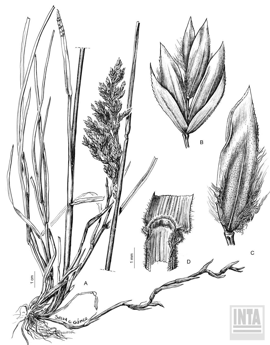 Plantas perennes, verdes a verde-azuladas, con rizomas estoloniformes delgados, forman macollos solitarios o agrupados, con innovaciones en general extravaginales o extra e intravaginales, catáfilos presentes; cañas de 5-70(-100) cm de alto, erectas o geniculadas en las bases, decumbentes aunque no enraizando por arriba de la base, entrenudos y nudos cilíndricos a débilmente comprimidos; nudos 1-2(-3), exertos, los proximales comúnmente incluidos; vainas cerradas en ¼-½ de su longitud, cilíndricas a levemente comprimidas, generalmente glabras o, a veces, moderadamente pubescentes, con bases glabras, cuellos lisos, glabros; lígulas de 0,9-2(-3) mm de largo, lisas o escabrosas, ápices truncados a redondeados, menos frecuentemente obtusos, ciliolados o glabros; láminas de los macollos extravaginales similares a las de la hoja bandera, las de los macollos intravaginales se distinguen por ser más angostas, de 10-45 cm x (0,4-)1-4 mm, setáceas, planas, conduplicadas a involutas; láminas caulinares de (0,4-)2-4(-6) mm de ancho, planas o plegadas, involutas hacia los margenes, suaves y laxas a moderadamente firmes, lisas en cara abaxial, glabras, lisas en cara adaxial o esparcídamente escabrosas, frecuentemente con pelos esparcidos, delgados, erectos o adpresos, curvados, sinuosos o derechos, de 0,2-0,8 mm de largo, láminas abruptamente contraídas en el ápice, ápice navicular, láminas subiguales o láminas medias más largas, la bandera de 1,5-10 cm de largo. Inflorescencias de 2-15(-20) cm de largo, dos veces más largas que anchas, angostamente ovoides o ampliamente piramidales, poco contraídas a abiertas, esparcidas a moderadamente densifloras, con (1-)2-7(-9) ramas por nudo, las ramas de (1-)2-9 cm de largo, divergentes temprana o tardíamente, cilíndricas o angulosas, lisas o escasa a moderadamente escabrosas, espiguillas usualmente aglomeradas en la porción media distal. Espiguillas (2,5-)3,5-6(-7) mm de largo, comprimidas lateralmente, 2-5-floras, entrenudos de la raquilla mayormente menores a 1 mm de largo, lisos, glabros; glumas desiguales, usualmente más cortas que las lemmas adyacentes, lanceoladas, aquilladas, quillas leve a moderadamente escabrosas, o lisas; gluma inferior de 1,5-4(-4,5) mm de largo, angostamente lanceolada, 1-3-nervia; gluma superior de 2-4,5(-5) mm de largo, marcadamente más cortas o casi igualando la lemma inferior; callo lanoso, con un sólo mechón de pelos dorsales, o con mechones secundarios bajo cada nervio marginal, pelos de la mitad o más largos que la lemma; lemma de 2-4,5(-6) mm de largo, lanceolada, quilla y nervios laterales glabros o vellosos, superficies entre los nervios glabras o poco frecuentemente vellosas a puberulentas, lisas o escabrosas en la parte superior, nervios intermedios prominentes, margenes angosta a ampliamente hialinos, glabros, ápices agudos; pálea escabrosa, algunas veces puberulenta sobre las quillas, región intercostal angosta, glabra, o raramente hispídula; anteras fértiles de 1,2-2 mm de la