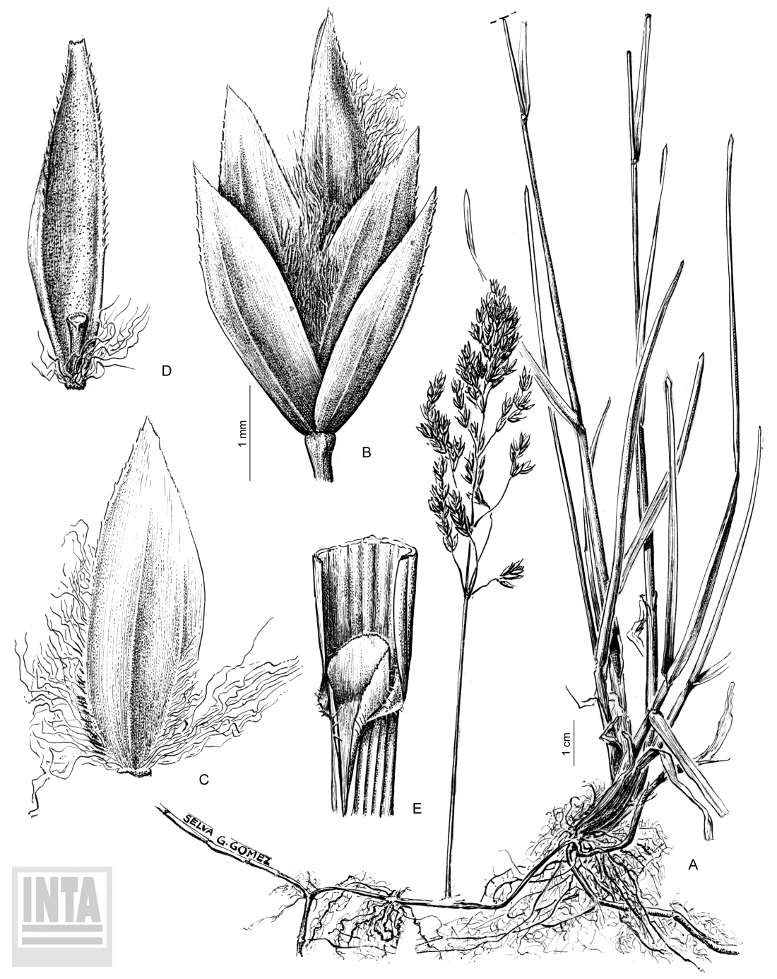 A, planta; B, espiguilla; C, antecio inferior; D, pálea; E, lígula.