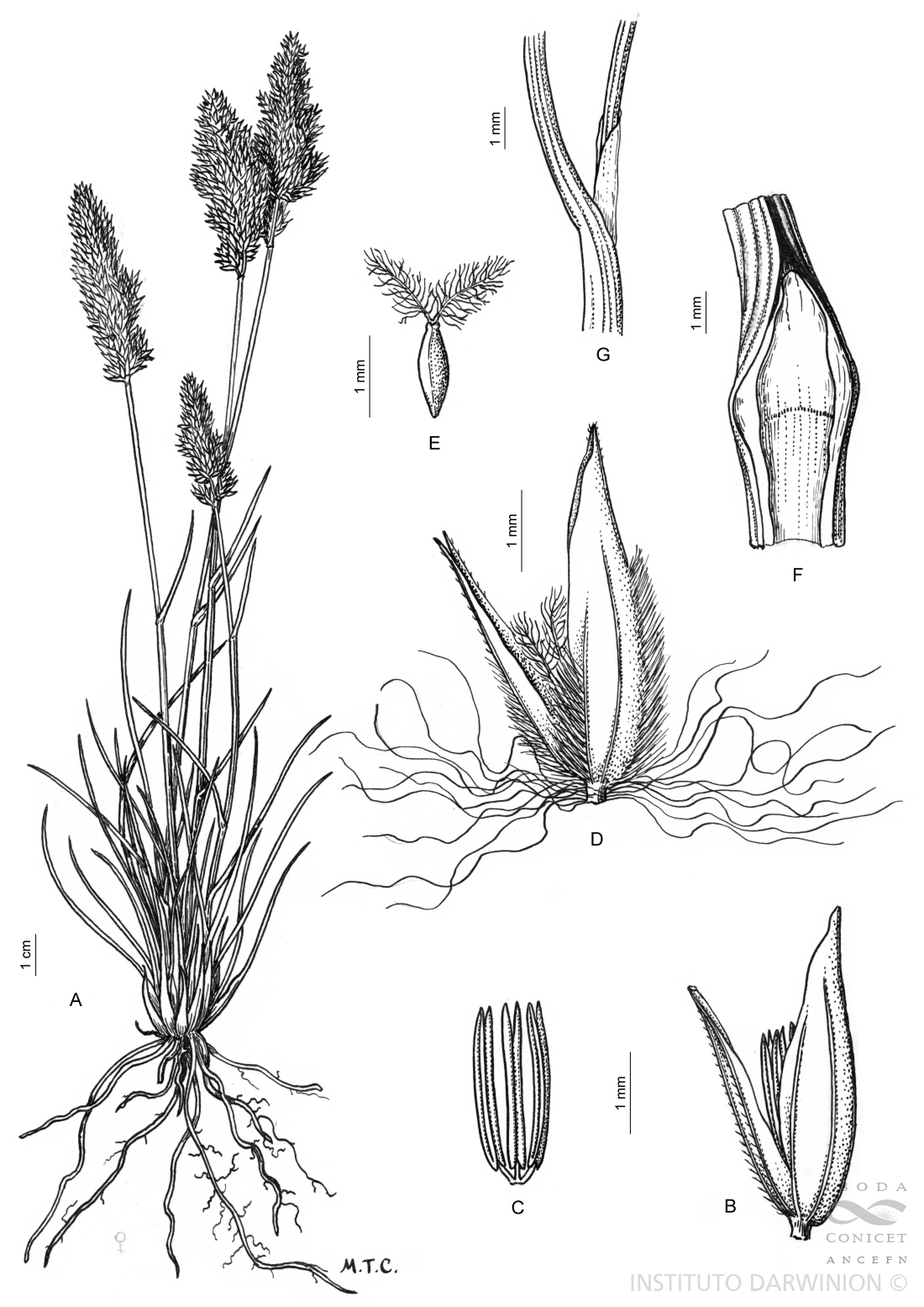A, planta; B, antecio maculino; C, flor masculina; D, antecio femenino; E, flor femenina; F y G, detalles de la lígula.