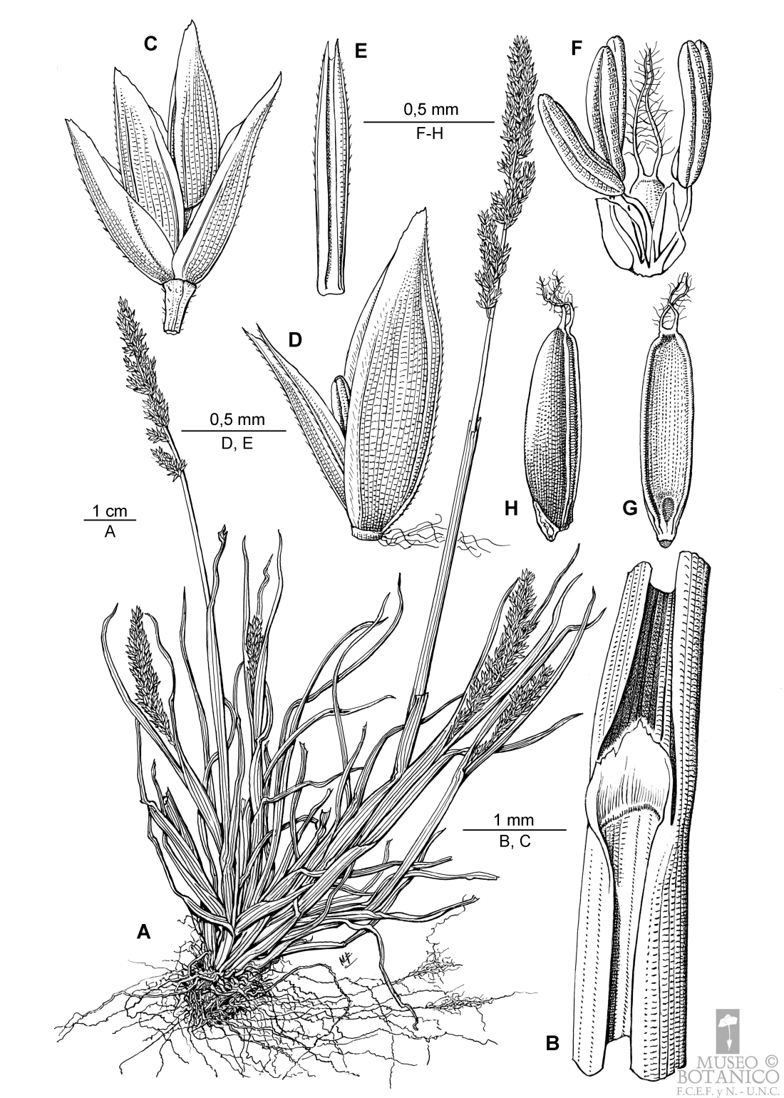 A, hábito; B, lígula; C, espiguilla; D, antecio basal; E, pálea; F, flor perfecta y lodículas; G-H, cariopsis, vista escutelar y lateral.