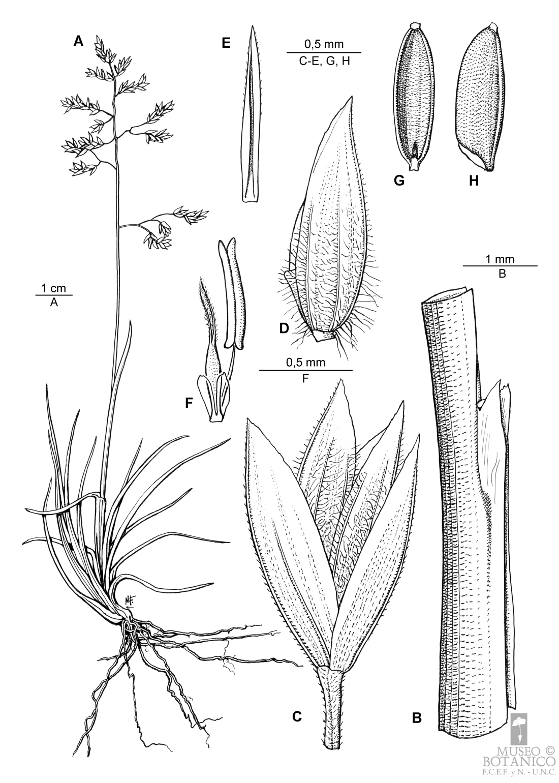Plantas monoclinas, perennes, cespitosas, gráciles, hasta de 20 cm de alto; cañas con 2(-3) entrenudos largos, de 5-15 cm de largo; lígulas de 2-3 x 2 mm, truncadas, decurrentes con la vaina; láminas de 3,5-10 cm x 1-3 mm, tiernas, flexuosas, suaves, laxas, planas o plegadas, escabriúsculas principalmente el ápice. Inflorescencias de 3,5-7,5 (8) cm x 2,5-6 mm, piramidales o anchamente ovadas, pauciespiculadas, abiertas, laxas, exertas, ramas patentes, delicadas, 2 ramas en los nudos basales. Espiguillas de 2-2,5 x 2 mm, 2-3-floras, comprimidas; glumas iguales o ligeramente desiguales, casi de la misma longitud que los antecios, pero nunca más largas que ellos, agudas, anchamente lanceoladas y con la carina totalmente escabrosa o sólo en la mitad superior, bordes membranáceos delgados; gluma inferior de 2-2,5 x 0,6 mm, 1-3-nervia; gluma superior de 2-2,6 x 0,8 mm, 3-nervia; lemma de 1,8-2 mm de largo x 0,6 mm de semiancho, 5-nervia, lanceolada, aguda, inconspicuamente pubescente en la mitad inferior especialmente sobre los nervios; pálea de 1,5-2 x 0,5 mm, angostamente lanceolada, membranácea, brevemente pestañosa; antecios perfectos, con una única antera de 0,5-0,8 mm de largo; cariopsis de 1 mm de largo.