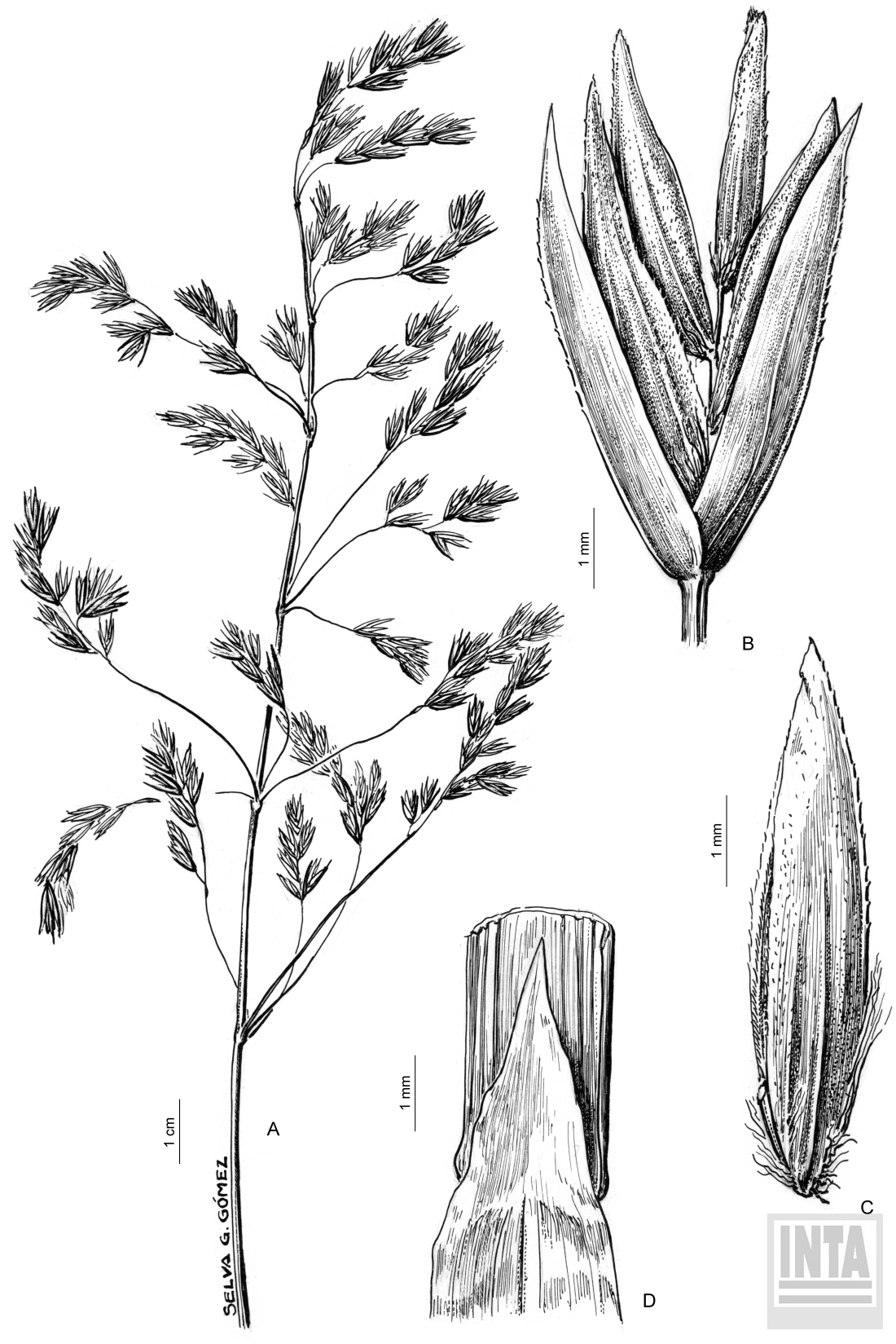 A, inflorescencia; B, espiguilla; C, antecio inferior; D, lígula.