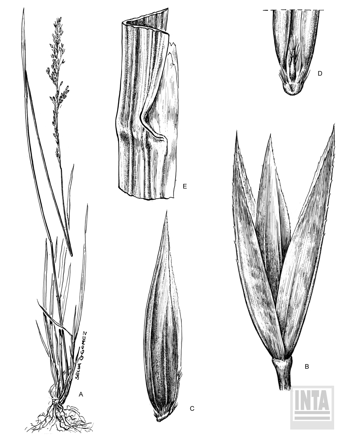 A, planta; B, espiguilla; C, antecio; D, detalle de la base del antecio; E, lígula.