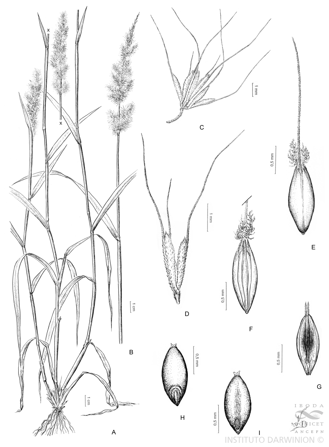 Plantas perennes de 15-60 cm de alto; cañas erguidas o geniculadas y enraizadas en los nudos inferiores; vainas escabrosas, menores que los internodios; lígulas membranáceas, de 1,5-3(-5) mm de largo, decurrentes en las vainas, escabriúsculas en la cara abaxial; láminas planas, hasta de 6 mm de ancho, escabriúsculas. Inflorescencias en panojas compactas, normalmente interrumpidas, verde-amarillento o violáceas, de 5-15 x 2 cm, ramas breves, adpresas al eje, las espiguillas dispuestas hasta su base, raquis, ramas y pedicelos escabrosos. Espiguillas subsésiles sostenidas por pedicelos cortos, normalmente menores de 1 mm de largo, que se desarticulan a la menor presión; glumas subiguales, de 2-2,5(-3) mm de largo, escabrosas, de dorso equinulado al igual que las quillas, ápice 2-lobado, aristadas, arista normalmente recta, de 1,5-4,5(-6) mm de largo; antecio glabro, menor que ½ de la longitud de las glumas; lemma membranácea, brillante, truncada, 5-nervia, los nervios laterales normalmente terminados en arístulas, el central terminado en una arista que normalmente sobrepasa la longitud de las glumas; pálea 2-aquillada, mútica, aproximadamente igual a la longitud de la lemma; lodículas 2, membranáceas, glabras; anteras de 0,5-0,6 mm de largo; cariopsis castaño-clara, con surco poco notable en su cara ventral, escudete embrional menor que ½ de su largo, endosperma farináceo blanco.