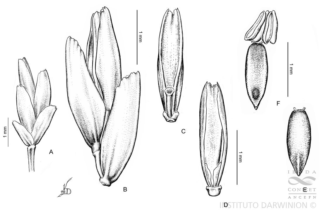 A, espiguilla; B, antecios; C, pálea y artejo de la raquilla; D, pálea y lodñiculas; E, cariopsis vista dorsal; F, cariopsis vista ventral.