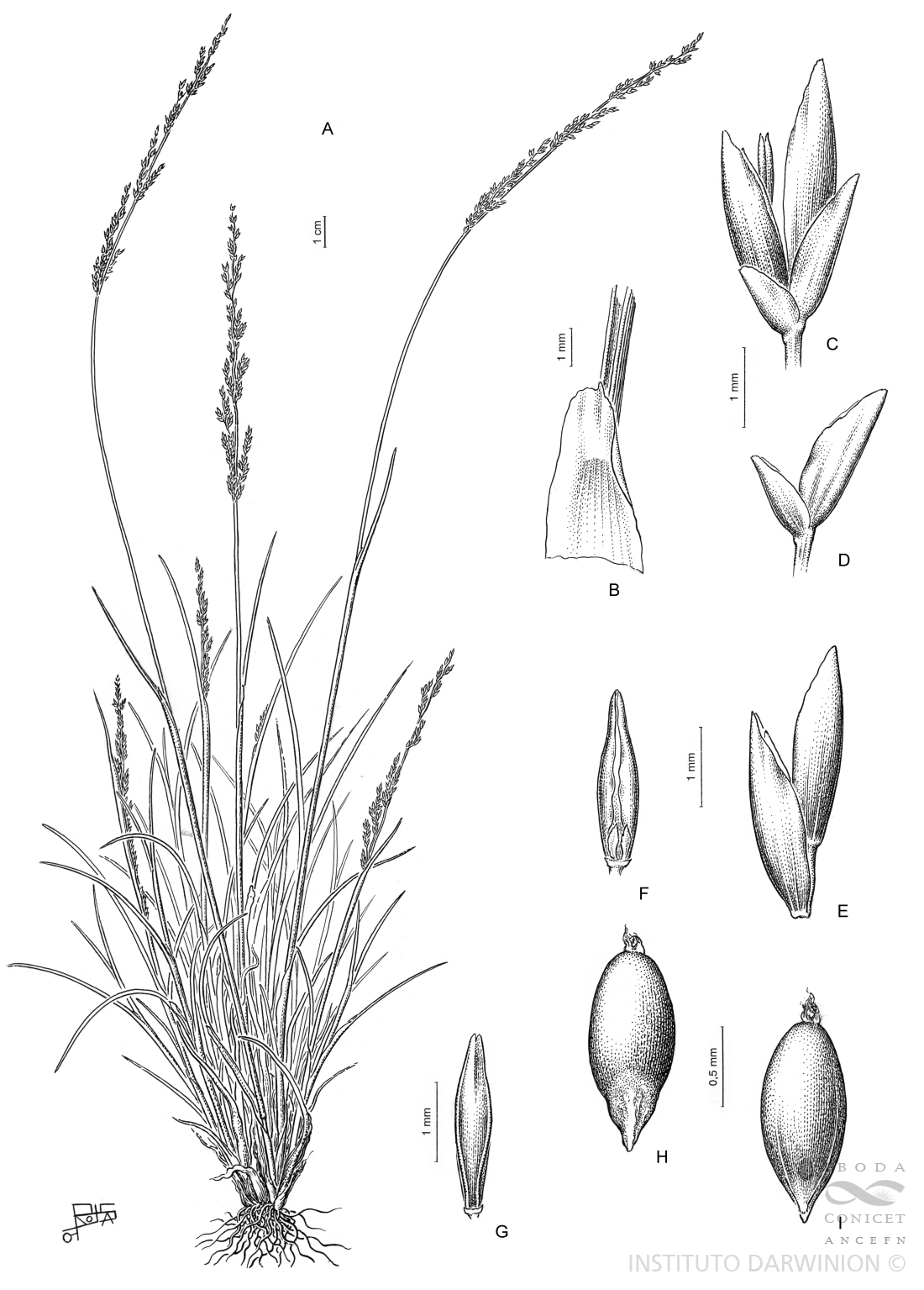 A. Planta. B. Región ligular. C. Espiguilla, vista lateral. D. Glumas. E. Antecios. F. Pálea, vista ventral y lodículas. G. Pálea, vista dorsal. H. Cariopsis, vista escutelar. I. Cariopsis, vista hilar.