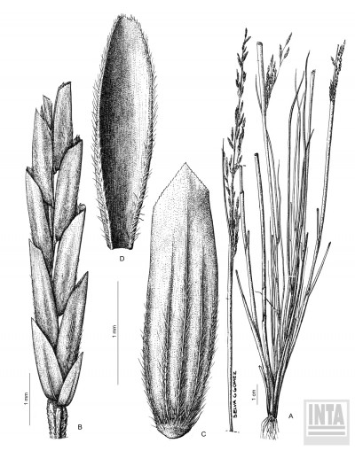 Plantas perennes, cespitosas, de 15-70 cm de alto; cañas a veces geniculadas en los nudos basales; vainas glabras, más largas que los entrenudos; lígulas hialinas, agudas, de 2-3 mm de largo en las hojas de las cañas; láminas conduplicadas, de 2-5 cm x 0,5-1 mm. Inflorescencia una panoja erecta, laxa, contraída, las ramas arrimadas al eje, de 10-30 cm de largo, subincluidas en las vainas correspondientes. Espiguillas linear-oblongas, 5-12-floras, de 5-10 mm de largo; glumas subiguales, agudas a subagudas, la inferior 1-nervia, de 1,5-2 mm de largo, la superior 3-nervia, de 2-2,8 mm de largo; lemma aguda o subobtusa, 5-nervia, pubescente en la ½ inferior de los nervios y a veces entre ellos, de 2,8-3 mm de largo, los márgenes normalmente ciliolados; pálea de igual largo que su lemma o menor, ápice 2-lobado a levemente emarginado, carinas pubescentes en la ½ inferior, escabrosas hacia el ápice; lodículas 2, de 0,5 mm de largo; estambres 3, anteras de 0,4-0,5 mm de largo; cariopsis de 1,8-2 x 0,5 mm, hilo basal oval.