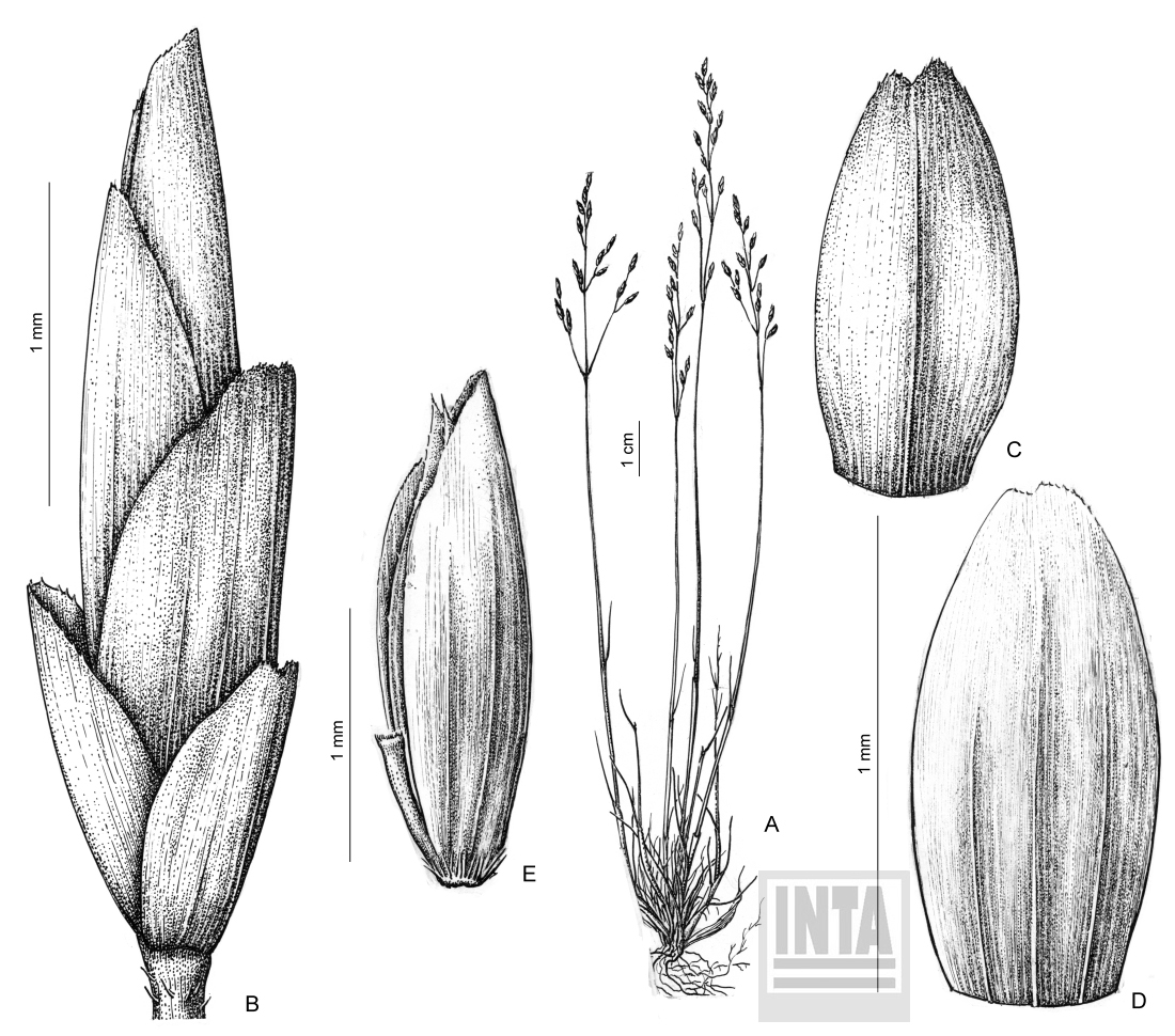 A, planta; B, espiguilla; C, gluma inferior; D, gluma superior; E, antecio.