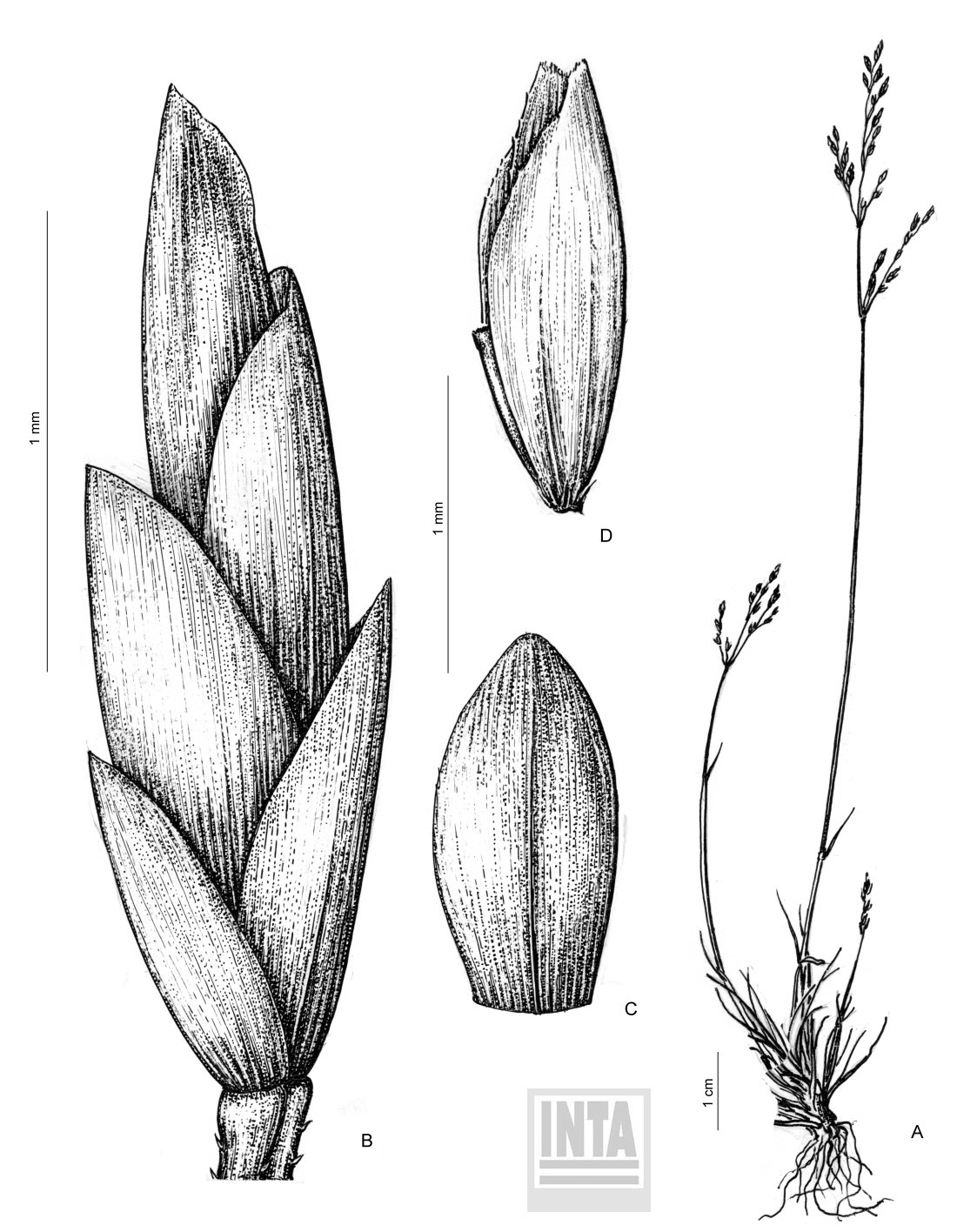 Plantas perennes, las que comúnmente forman matas muy compactas de 3-12 cm de alto; cañas glabras, erguidas o inclinadas; vainas estrechas, glabras; lígulas membranáceas, subobtusas, de 0,6-1,5 mm de largo; láminas involutas o convolutas, de 0,6 mm de ancho. Inflorescencia una panoja de 1-4 cm de largo, generalmente estrecha y subincluida en la vaina foliar correspondiente, con 1-3 ramas pauciespiculadas en cada nudo; raquis glabro en la base y escabroso en la parte superior. Espiguillas 2-4(-6)-floras, de 2-4 mm de largo, subsésiles, con pedicelos cortos; glumas glabras, ovadas, obtusas, la inferior de 0,4-1 mm de largo, enervia, la superior de 1,5-1,9 mm de largo, 3-nervia; raquilla glabra, artejos de 0,4 mm; lemma glabra, ovada, obtusa, de 1,5-1,8 mm de largo, con los nervios inconspicuos; pálea subigual a su lemma, quillas escabrosas en la parte superior, raro en toda su longitud; lodículas 2, de 0,5 mm de largo; estambres 3, anteras de 0,3-0,7 mm de largo; cariopsis ovoidea, de 1,2-1,5 x 0,6 mm, hilo basal oval.