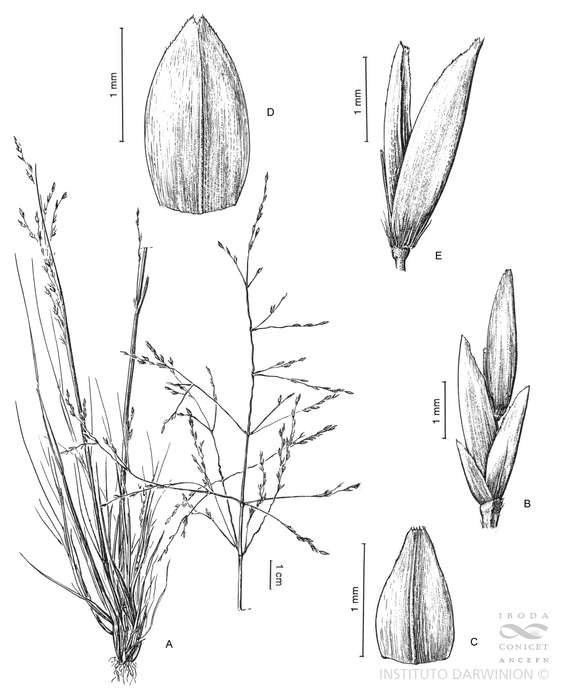 Plantas perennes, cespitosas, de 10-40 cm de alto; cañas glabras, erectas; vainas lisas, glabras; lígulas membranáceas, triangulares, agudas, de 1,2-3, 5 mm de largo; láminas angostas, filiformes, involutas, de 1-1,2 mm de ancho. Inflorescencia una panoja laxa, subincluida en la vaina foliar correspondiente, de 10-25 cm de largo, el eje glabro en la parte inferior, escabroso en la parte superior lo mismo que las ramas y pedicelos; ramas verticiladas, breves, erectas o más o menos abiertas, divergentes y reflexas cuando maduras, pauciespiculadas. Espiguillas 2-3-floras, violáceo-variegadas, de 2,5-2,7 mm de largo; glumas obtusas a truncadas o el ápice emarginado, la inferior 1-nervia de 0,7-1 mm de largo, la superior 3-nervia, de 1-1,4 mm de largo, los nervios laterales breves; artejos glabros, papilosos, de 0,7-1 mm de largo; lemma coriácea, ovada, de 1,7-1,9 mm de largo, glabra 5-nervia, nervios laterales conspicuos; pálea de largo más o menos igual al de su lemma, quillas glabras o con pocas escabrosidades en la parte superior; callo con pelos cortos, rígidos; lodículas 2, de 0,45 mm de largo; estambres 3, anteras de 0,45-0,7 mm de largo; cariopsis ovoidea, de 0,8-1 mm de largo, hilo basal, circular.