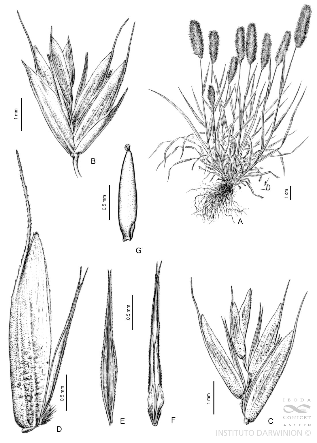 Plantas de 5-20 cm de alto; lígulas de 1-2 mm de largo; láminas de 2-15 cm x 1-3 mm, lineares, planas, pilosas. Inflorescencia en panoja espiciforme densa de 1,5-6(-12) cm de largo. Espiguillas 4-6-floras, excepcionalmente 1-2 espiculadas, de (2,8-)4-5(-7) mm de largo, cortamente pediceladas; glumas cortamente pilosas, excepcionalmente glabras, la inferior 1-nervia, de 2-2,5 mm de largo, la superior 3-nervia, de 3-3,5 mm de largo; lemma de 2,8-3,7 mm de largo, lanceolada, 5-nervia, pilosa, pelos con base tuberculada o tuberculado-hirsuta, con el ápice 2-dentado y con arista de 1-3 mm de largo, recta, que nace entre ambos dientes; pálea menor que la lemma, hialina, 2-dentada; estambres 3, de 0,2-0,5(-1,2) mm de largo; cariopsis comprimida lateralmente, libre entre las glumelas.