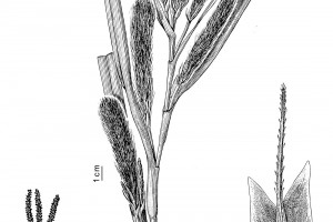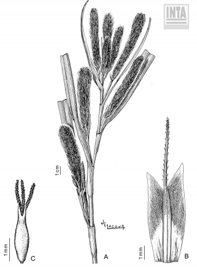 Rizoma grueso estolonífero. Tallo de 60-120 cm de alto, triquetro. Hojas más largas que el tallo de 8-14 mm de ancho. Espigas 6-10, las 2-4 superiores masculinas, la terminal hasta de 5 x 1 cm, aproximadas, brevemente pedunculadas, la inferior a veces distante; glumas femeninas de ápice bidentado con una arista larga, escabrosa. Utrículos de 5-6 mm, ovoide-oblongos, apenas nervados, largamente estipitados, bruscamente contraídos en rostro mediocre, bidentado. Aquenio oblongo-ovoide, granuloso, estipitado.