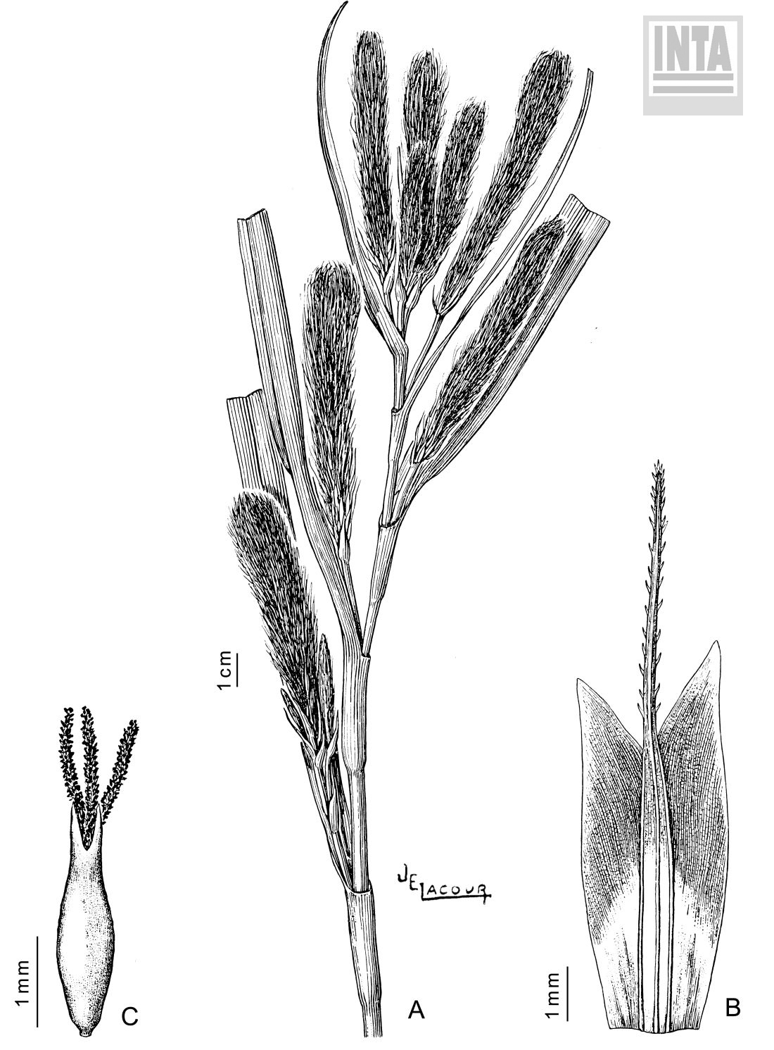 Rizoma grueso estolonífero. Tallo de 60-120 cm de alto, triquetro. Hojas más largas que el tallo de 8-14 mm de ancho. Espigas 6-10, las 2-4 superiores masculinas, la terminal hasta de 5 x 1 cm, aproximadas, brevemente pedunculadas, la inferior a veces distante; glumas femeninas de ápice bidentado con una arista larga, escabrosa. Utrículos de 5-6 mm, ovoide-oblongos, apenas nervados, largamente estipitados, bruscamente contraídos en rostro mediocre, bidentado. Aquenio oblongo-ovoide, granuloso, estipitado.