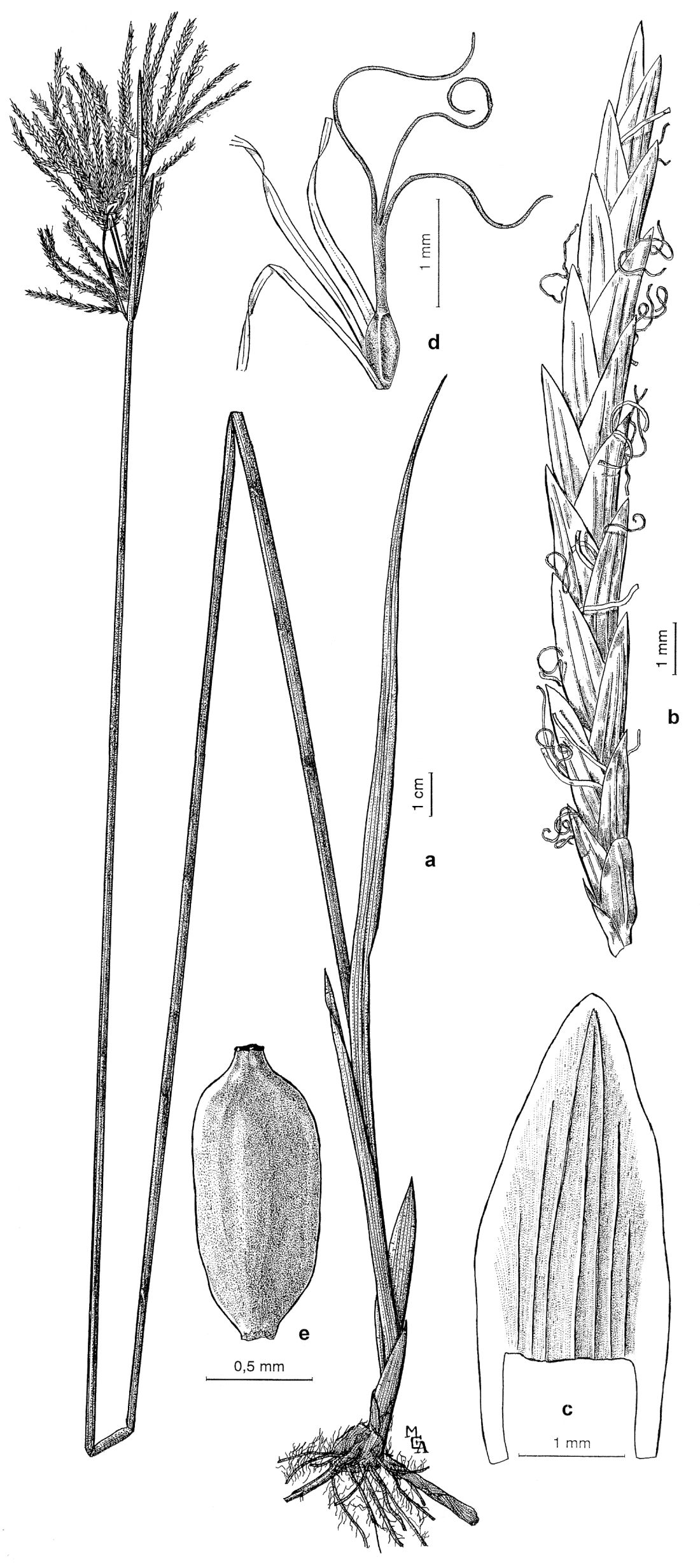 A. Planta. B. Espiguilla. C. Gluma alada, vista dorsal. D. Flor. E. Aquenio.