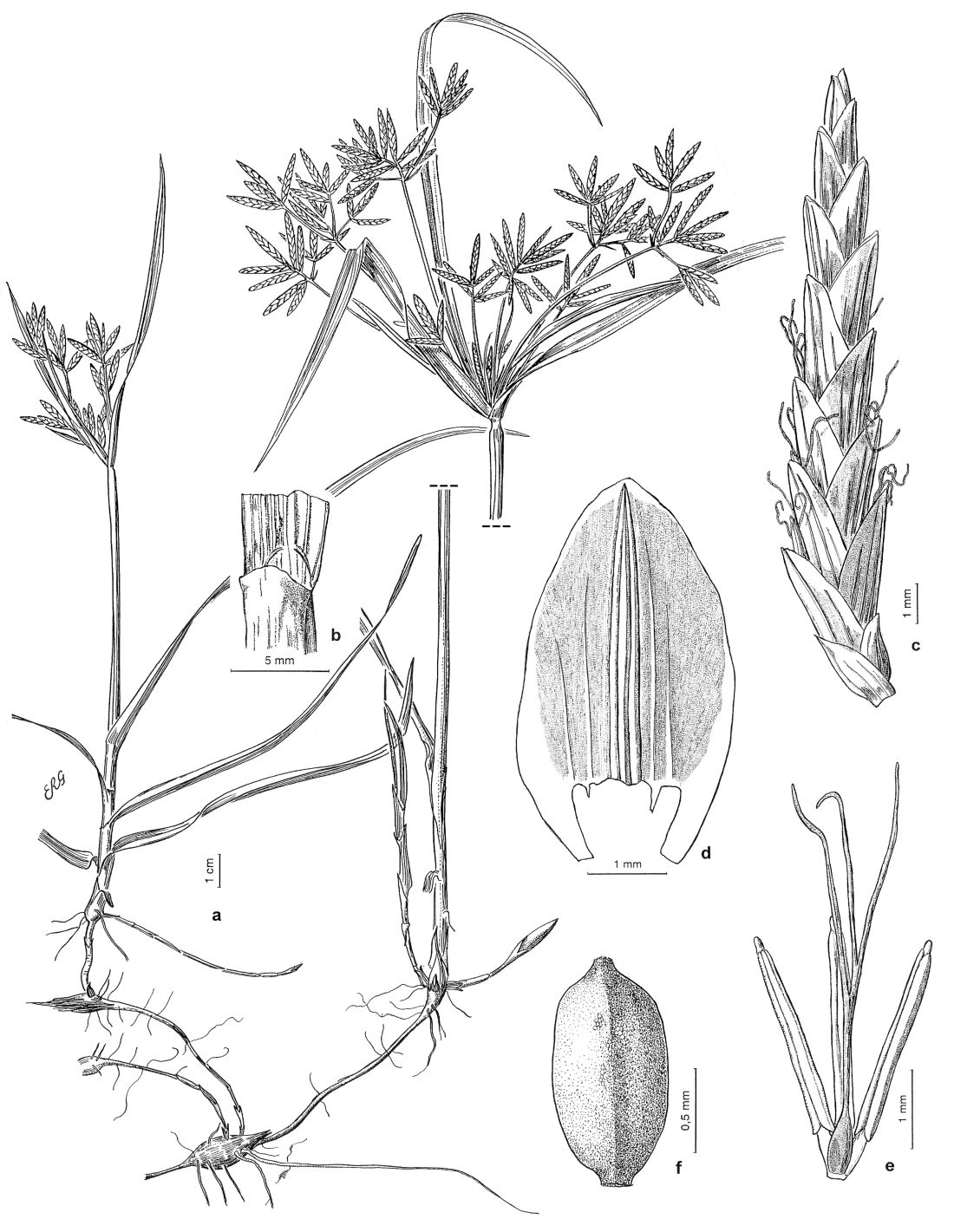 A. Aspecto de la planta con estolones, rizomas y tubérculos. B. Base de la hoja con repliegue ligular. C. Espiguilla. D. Gluma con alas decurrentes. E. Flor. F. Aquenio